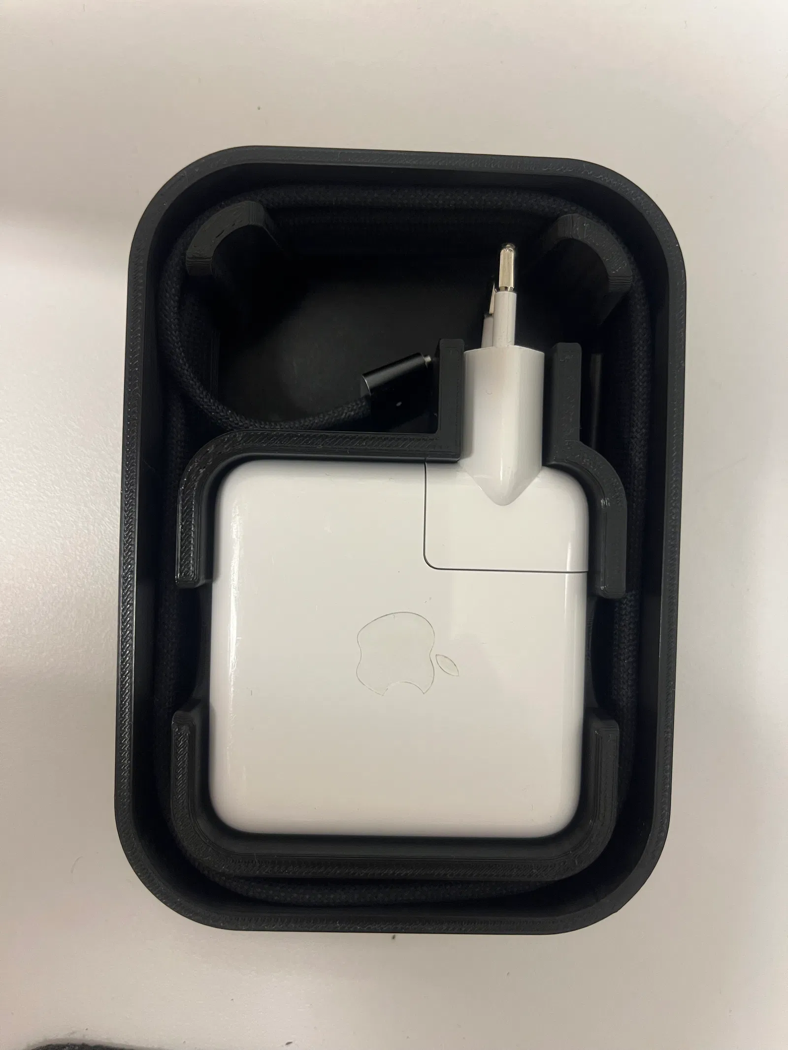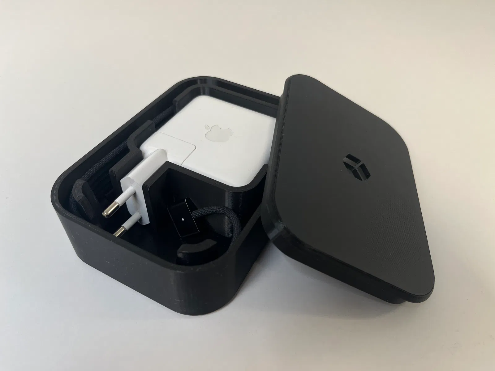 Hộp đựng bộ sạc MacBook Pro thiết kế hình vuông nhỏ gọn giúp bảo vệ và giữ cho dây cáp luôn ngăn nắp. Hỗ trợ cho cả hai kích thước sạc 65 mm (70 W) và 80 mm để bạn thoải mái lựa chọn in ấn.