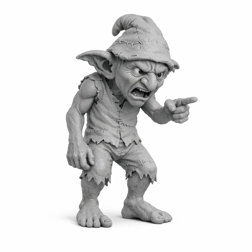 Yêu tinh chính là những chú lùn (gnome) phiên bản mới! Hãy quên đi mấy chú lùn bụng phệ với đôi má hồng hào đi! Yêu tinh mới là xu hướng hiện nay! Trong chậu cây, trên kệ, ngoài vườn, giữa hai cuốn sách, trên bàn làm việc, trong tủ chén, hay thậm chí trong tủ đựng bánh... Chúng có thể xuất hiện ở bất cứ đâu! Lần này là MỘT gã yêu tinh cáu kỉnh khác, đang la hét vào mặt ai đó và chỉ tay về phía họ. (Nếu đặt cạnh gã yêu tinh cáu kỉnh trước của mình thì trông sẽ cực chất đấy...) Đây là một phần trong loạt các mẫu yêu tinh, mô hình này có khả năng tùy chỉnh kích thước rất tốt (nó có rất nhiều chi tiết, đừng nhìn vào bản in thử của mình nhé, mình in vội ở layer 0.2 vì tính hay nôn nóng, lại chẳng hề chà nhám hay làm gì cả...). Mình thường vẽ phác thảo, sau đó dùng AI để bổ sung chi tiết và độ sâu (chứ nếu mình tự chuyển bản phác thảo thành 3D thì nhìn chả khác gì tranh trừu tượng!), rồi lại dùng một AI khác để dựng hình 3D... Cuối cùng, mình chỉnh sửa các khiếm khuyết nhỏ (như thêm bớt ngón tay hay vài chi tiết lặt vặt khác...)