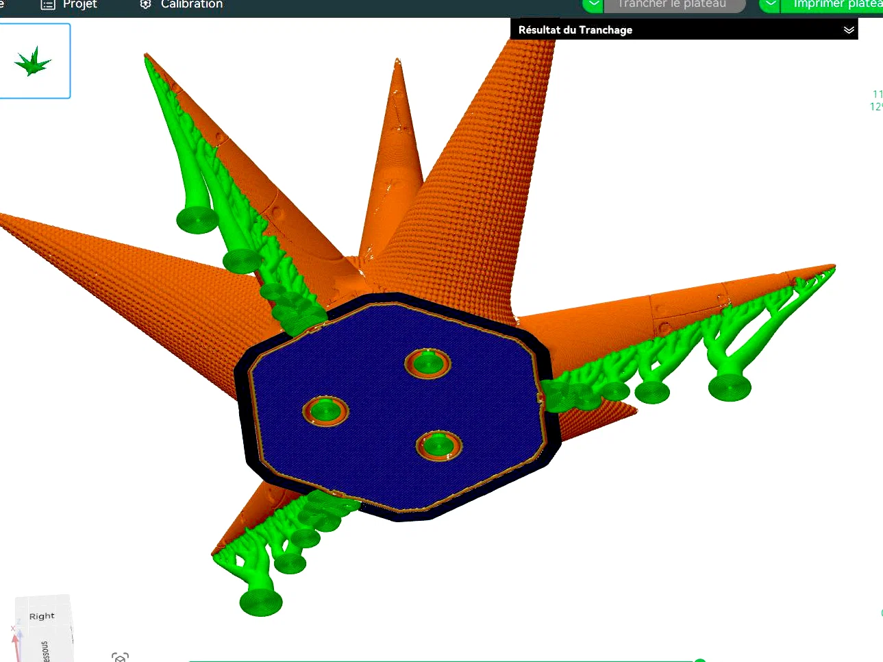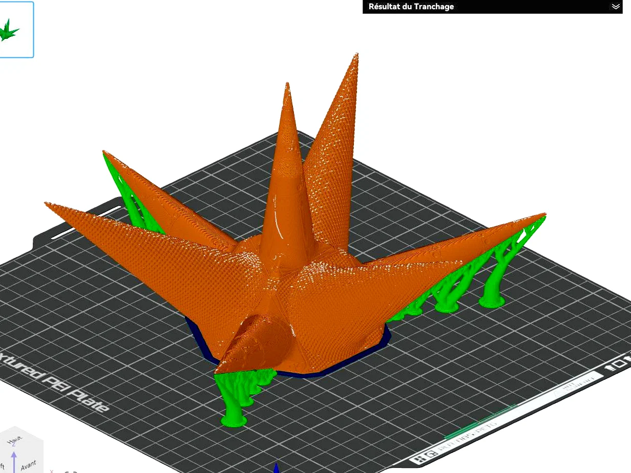 In ấn: Mình khuyên bạn nên dùng đầu phun (nozzle) 0.6 mm với độ dày lớp in là 0.25 mm. Hãy sử dụng tính năng "adaptive layers" (lớp in thích ứng) của phần mềm slicer cho những phần ít dốc hơn (xem chi tiết cài đặt).