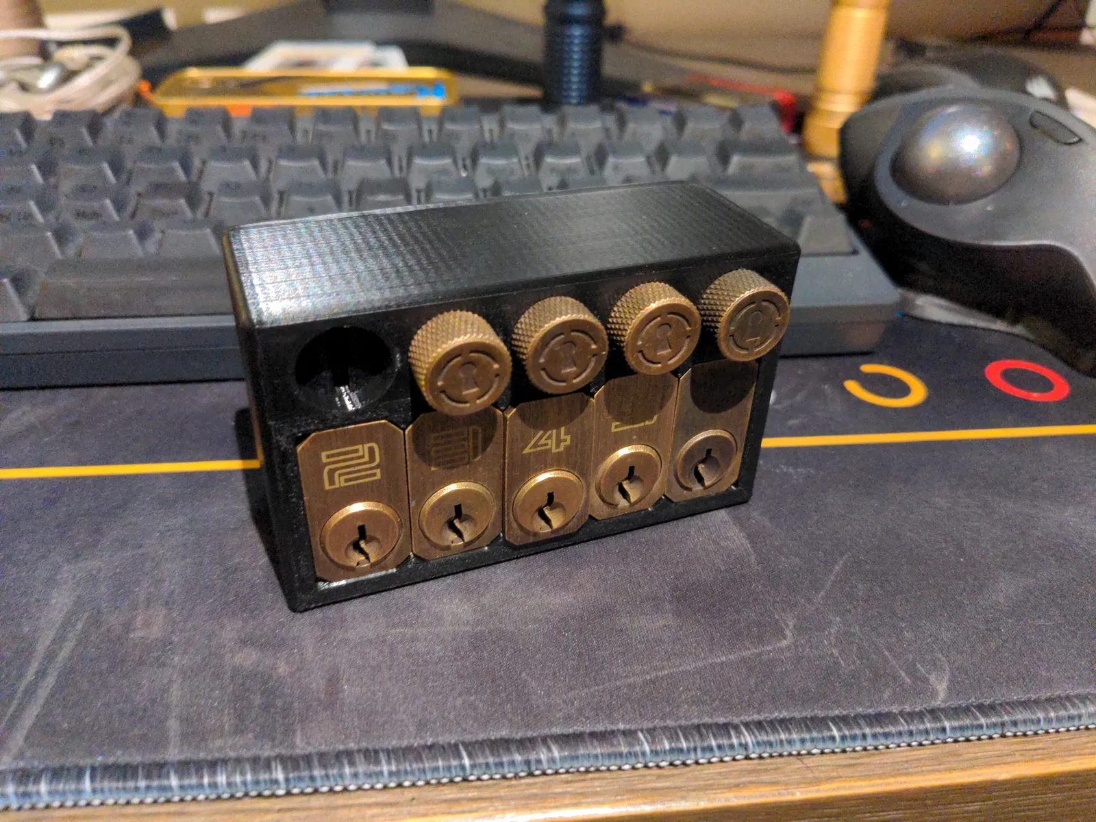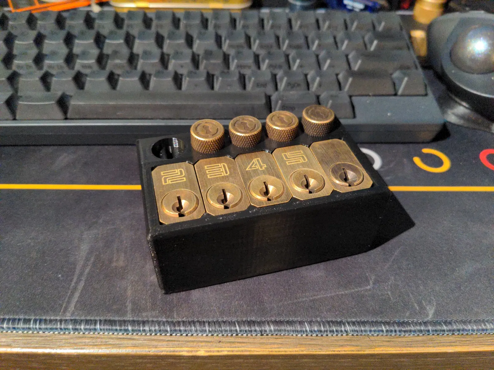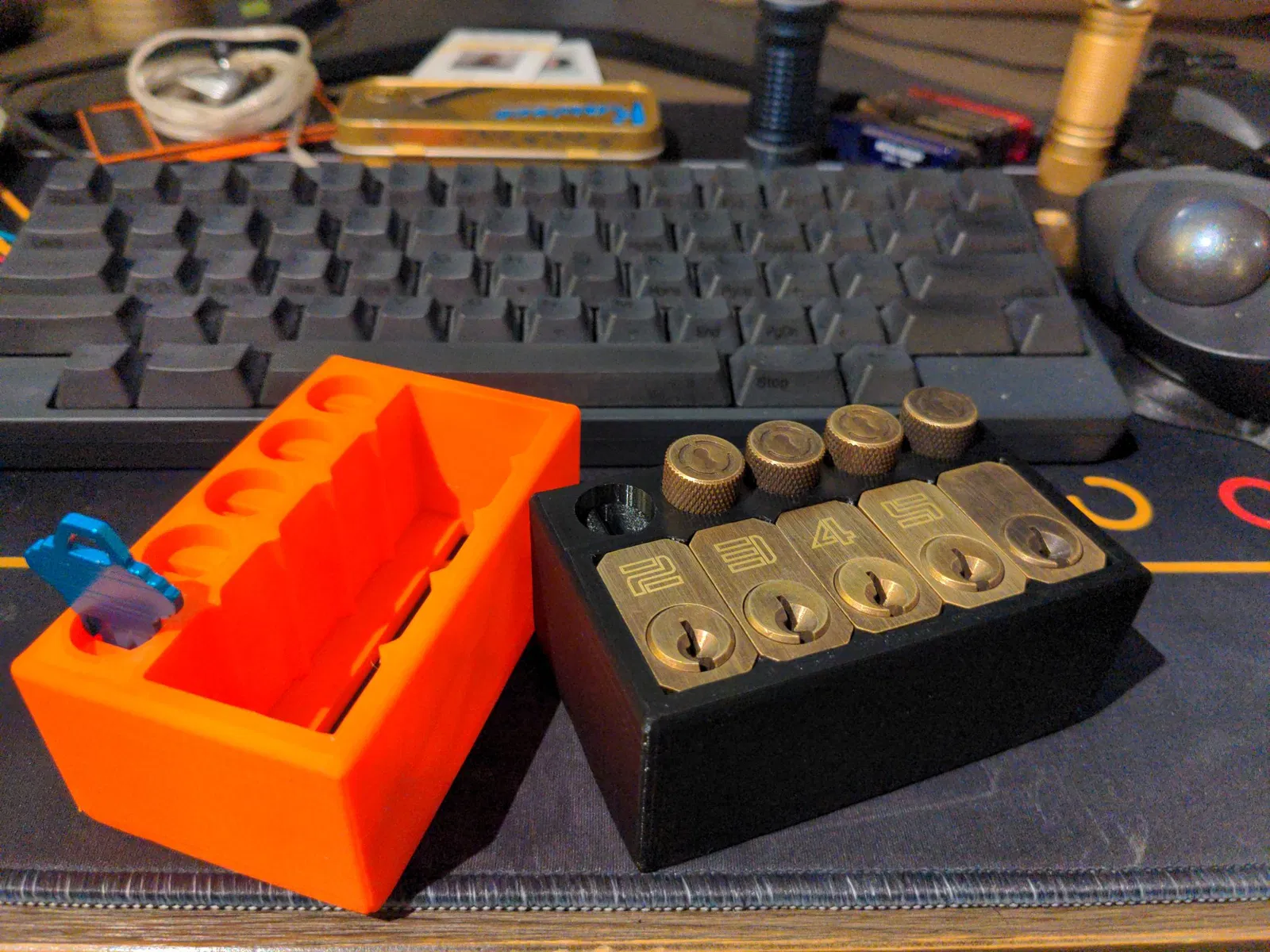 Thật sự thích cái giá khóa thực hành trước đây nhưng cá nhân tôi thấy nó hơi lỏng một chút so với sở thích của mình. Tôi đã mở OpenSCAD và điều chỉnh thiết kế ban đầu một cách ngẫu nhiên. Biến thể này giữ các khóa mà không có tiếng lạo xạo hay sự di chuyển đáng kể nào. Tôi cũng đã đục lỗ dưới khay một cách không tinh tế để cho phép đẩy các khóa qua để dễ dàng tháo ra hơn.