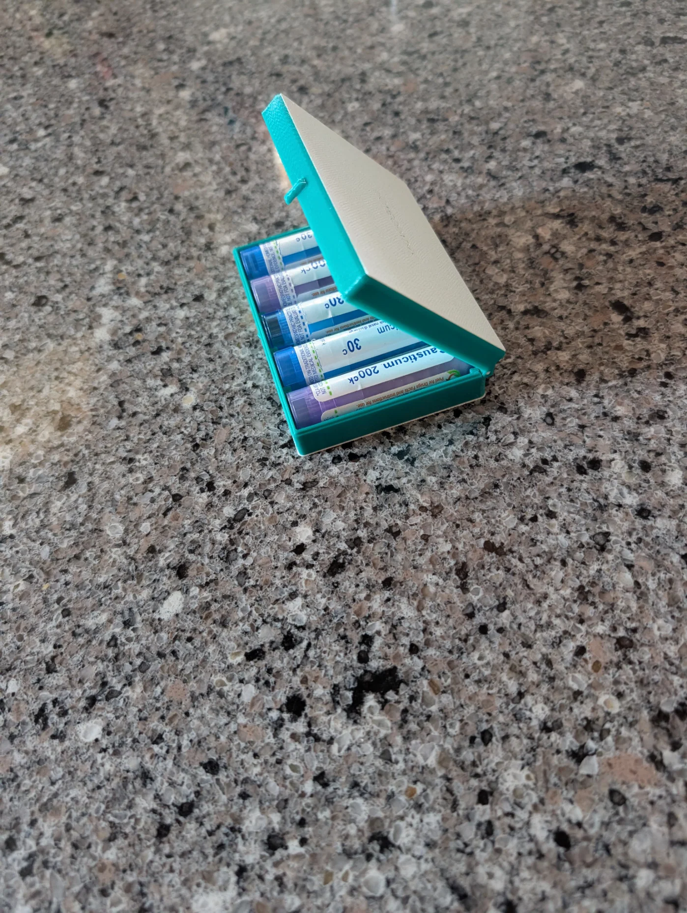 Một chiếc hộp nhỏ gọn, tiện lợi để đựng các ống thuốc Homeopathy của Boiron khi bạn đi du lịch hoặc mang theo trong túi xách. Hộp được thiết kế để lắp ráp và sử dụng một đoạn sợi nhựa (filament) làm chốt cho bản lề. Nếu bạn muốn tạo điểm nhấn nhiều màu sắc cho phần chữ, hãy thiết lập lệnh đổi màu tại độ cao 0.6mm.
