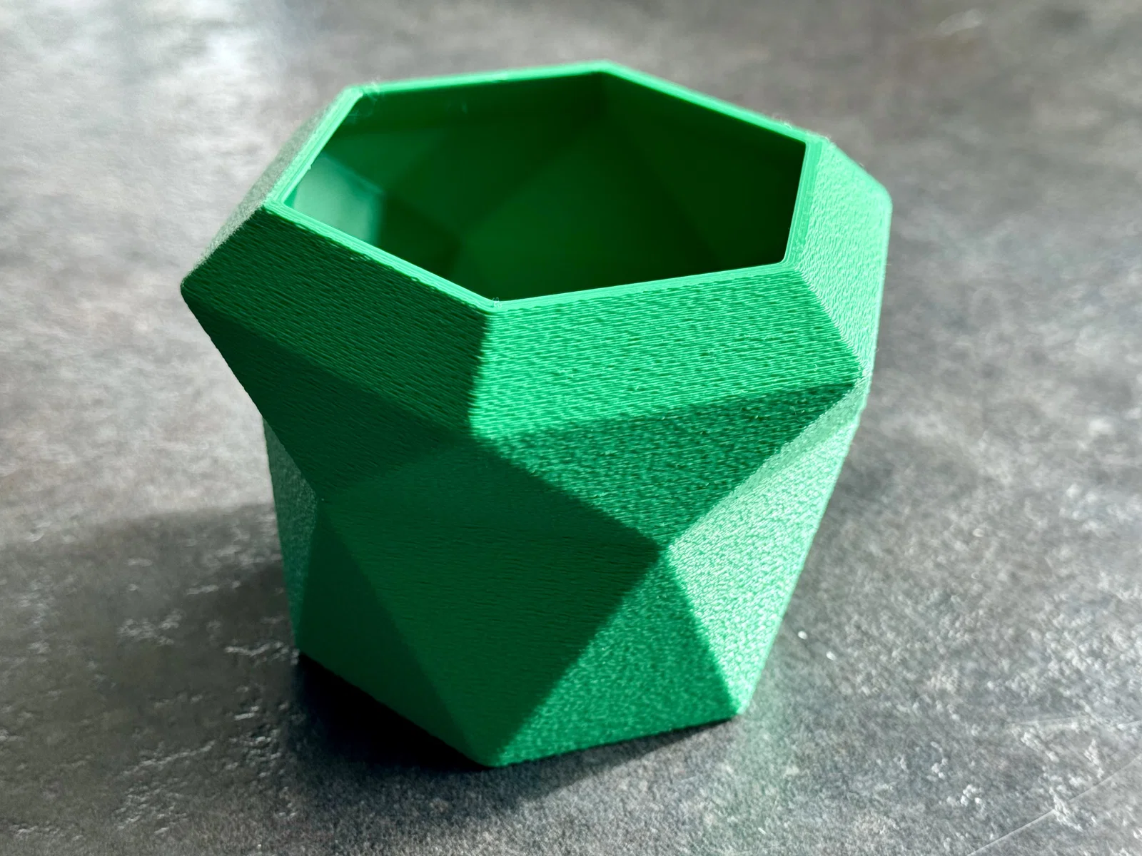 Một mẫu chậu cây hình lục giác nhỏ được thiết kế tỉ mỉ với độ dày đồng đều và các góc bo tròn hoàn hảo. Đây là một bài tập thực hành về thiết kế bề mặt low poly, kích thước 90mm, file G-code đã tích hợp sẵn texture bề mặt.