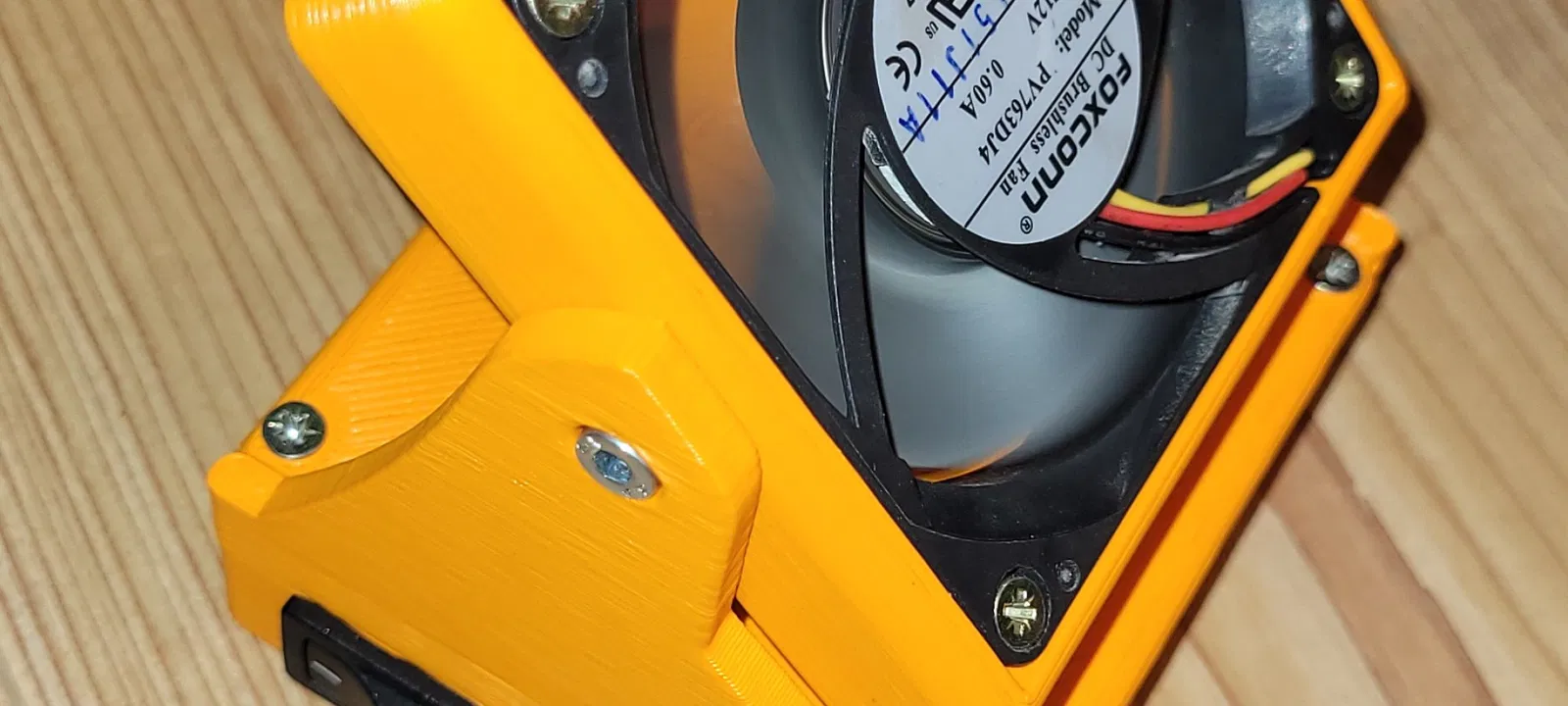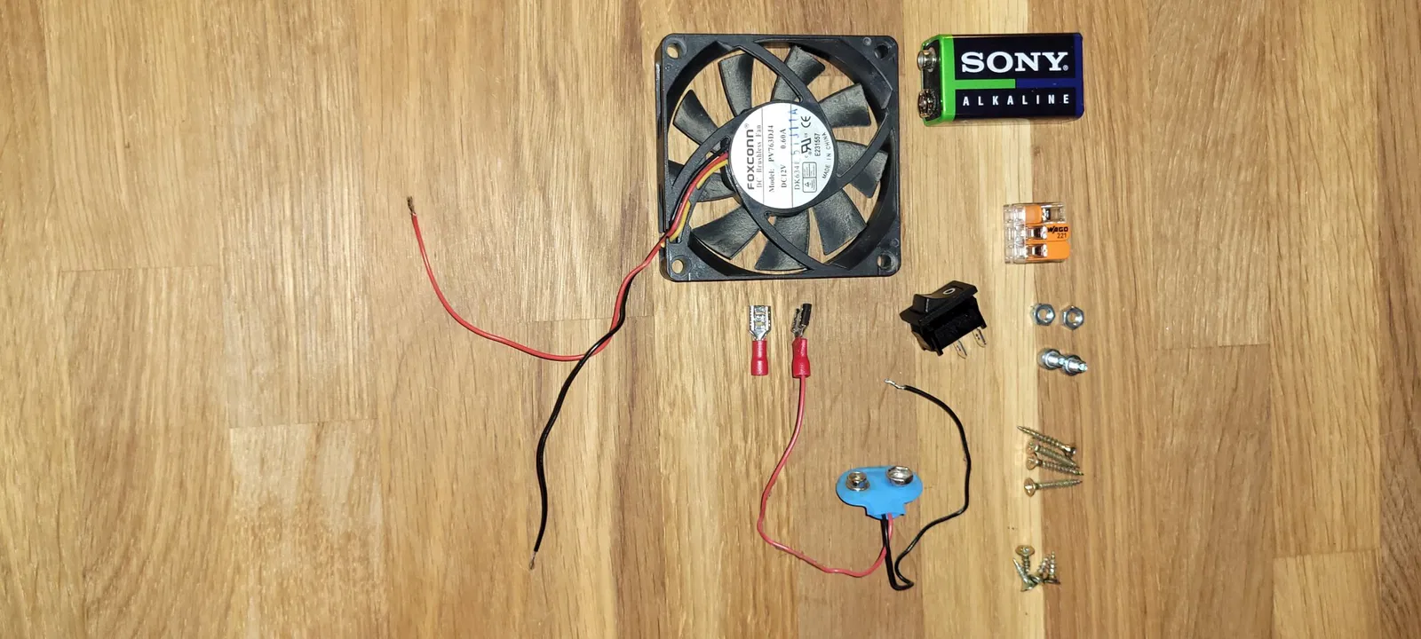 quạt bàn phong cách được làm từ quạt PC 70mm 12V đã qua sử dụng, được cấp nguồn bởi pin khối 9V và công tắc bật/tắt