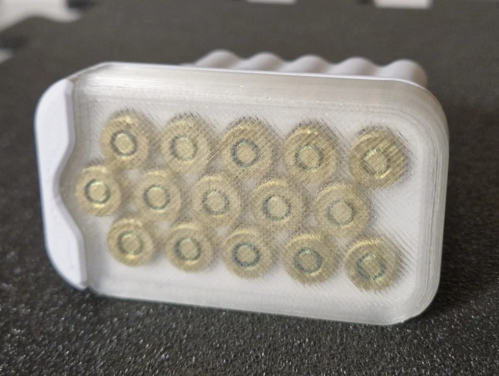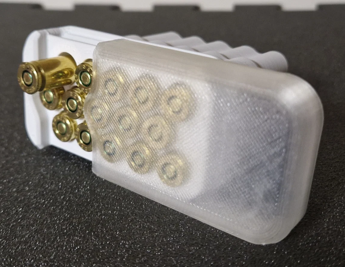 Hộp đựng 15 viên đạn đơn giản, thiết kế nắp trượt cùng khóa gài chắc chắn dành cho đạn cỡ .223 Remington / 5,56 x 45 mm NATO. In không cần support. Mình đã đo đạc theo tiêu chuẩn CIP và nới rộng thêm một chút không gian xung quanh - mẫu này dùng rất ổn với đạn S&B FMJ.