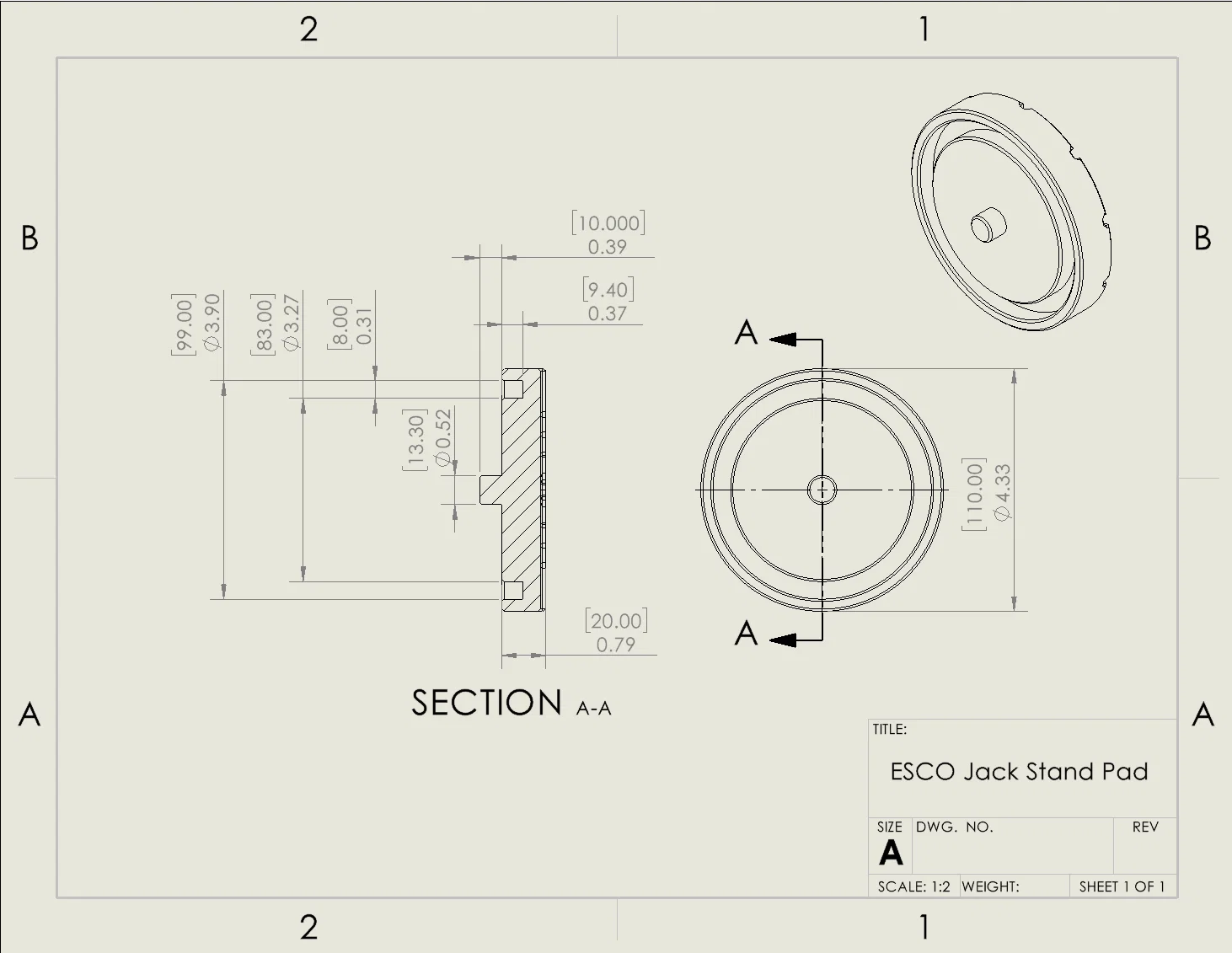 Đây là miếng đệm thay thế cho chân kê xe (jack stand) ESCO mẫu 10498. Sản phẩm này có thể dùng được cho các loại chân kê khác, nên mình đã đính kèm bản vẽ kích thước và file STEP để mọi người thuận tiện tùy chỉnh.