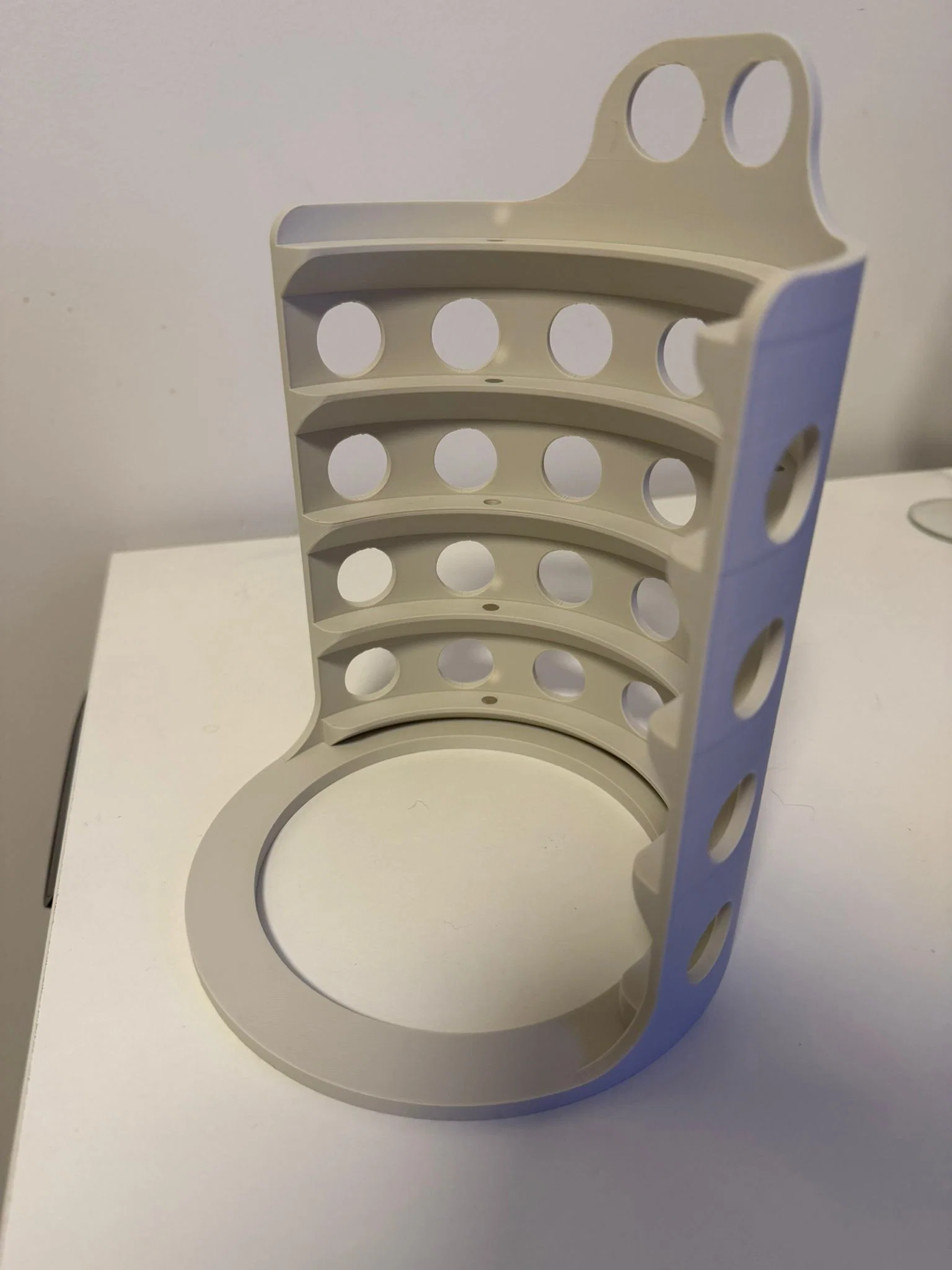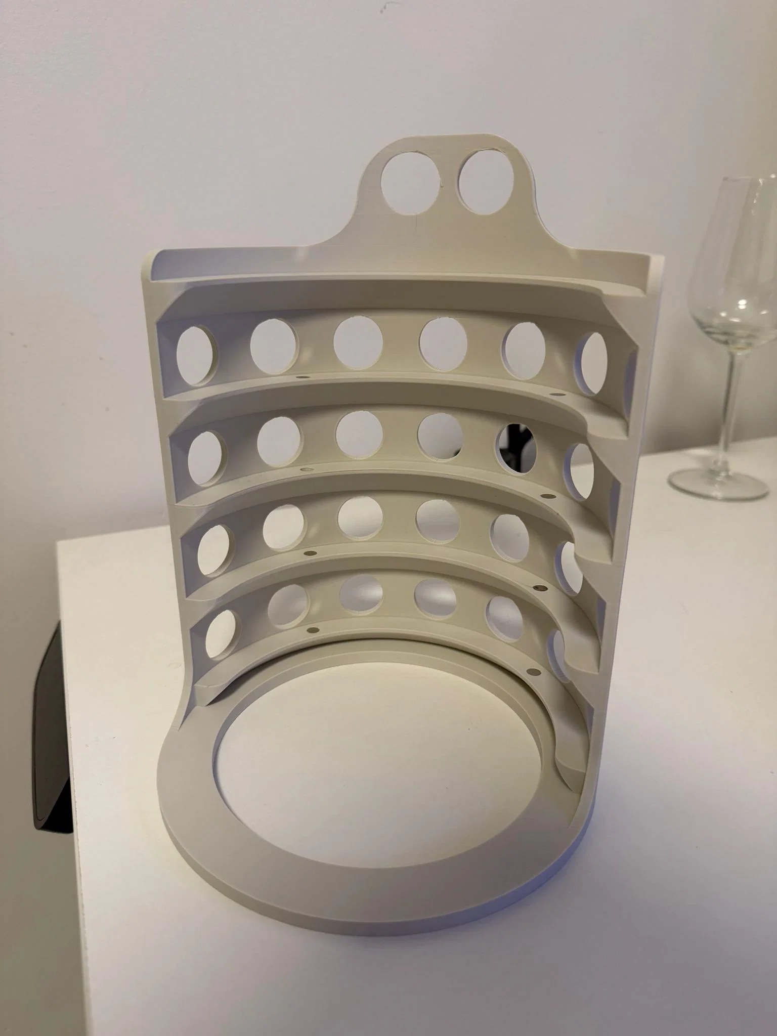 Mình làm cái này để giữ các đĩa cắt cho máy trộn bột Kenwood. Thiết kế này cần 10 viên nam châm 6x3mm. Có thể dùng được ngay cả khi không có nam châm, nhưng mình khuyên các bạn nên gắn thêm vào để đảm bảo độ chắc chắn. Giá đỡ giữ được 5 đĩa cắt. Các lỗ phía trên được thiết kế để dễ thao tác lấy đĩa, các lỗ còn lại chủ yếu để tiết kiệm nhựa. Sản phẩm này khả năng cao sẽ vừa với mọi loại đĩa, miễn là chúng có đường kính khoảng 160mm.