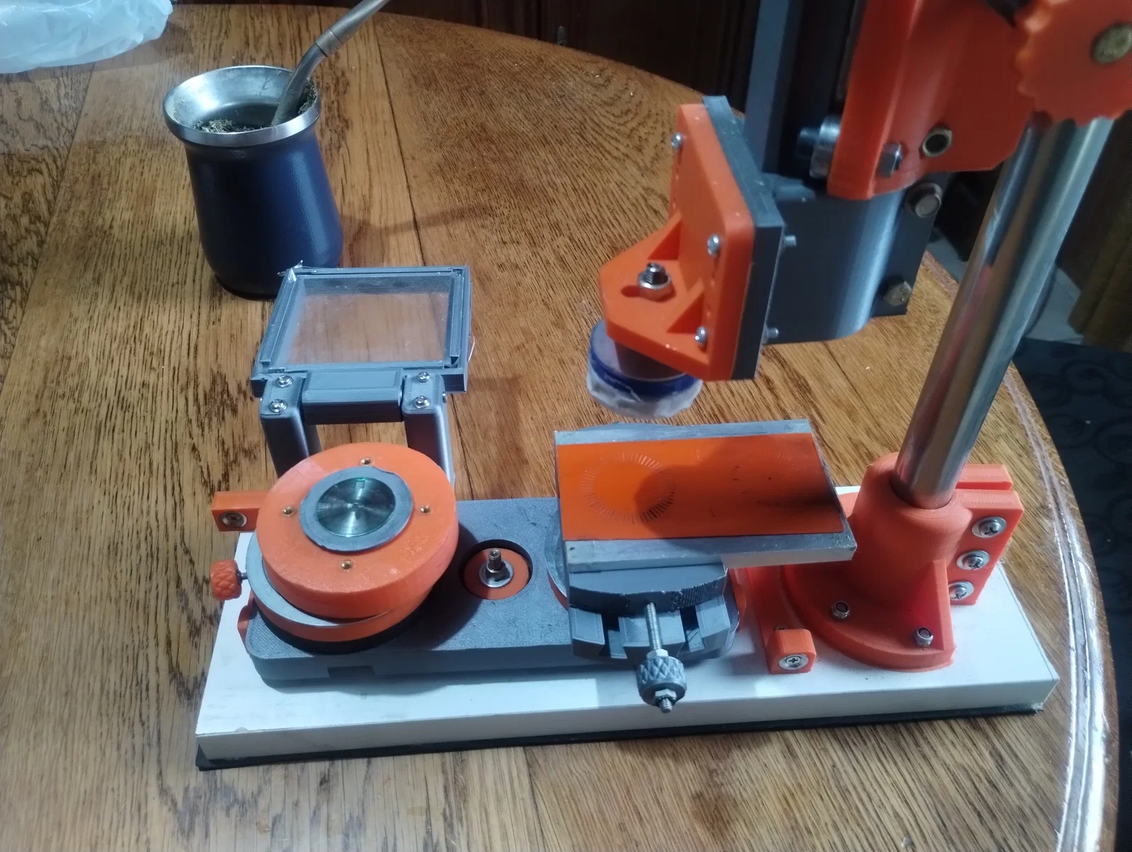 Thành phần này là một kiệt tác của luben111 (xem thiết kế gốc tại https://www.thingiverse.com/thing:1774326). Nó cho phép di chuyển linh hoạt trên các trục X, Y và xoay tròn, giúp việc định vị chính xác cả ê-tô lẫn giá đỡ mặt số trở nên dễ dàng.