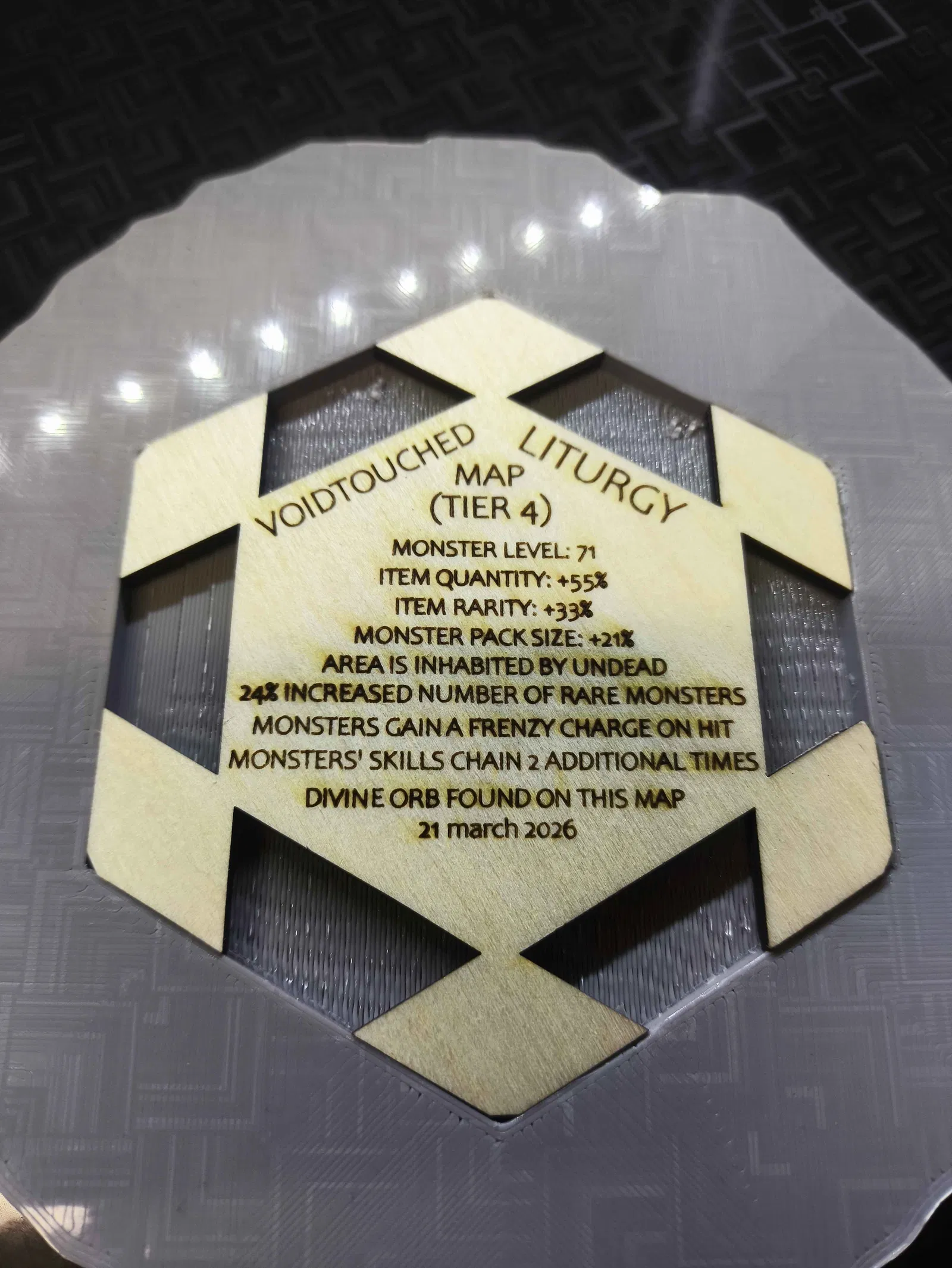 Mình đã tùy biến mẫu của riêng mình bằng cách tạo thêm một lỗ hình lục giác ở đáy để gắn miếng khắc laser ghi lại chỉ số bản đồ (map spec) đã mang lại cho mình viên Divine Orb đầu tiên.