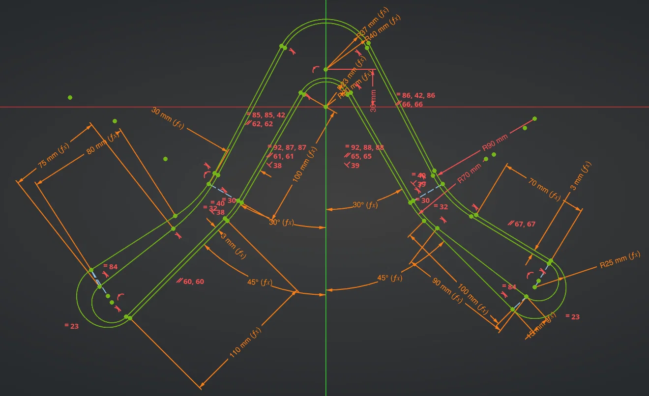 Đây là mẫu boomerang có thể tùy chỉnh thông số (parametric) trong FreeCAD. Bạn hãy thử xem qua bản vẽ sketch nhé - tất cả các kích thước như chiều dài và góc độ đều có thể thay đổi dễ dàng, mô hình sẽ tự động cập nhật theo đó.