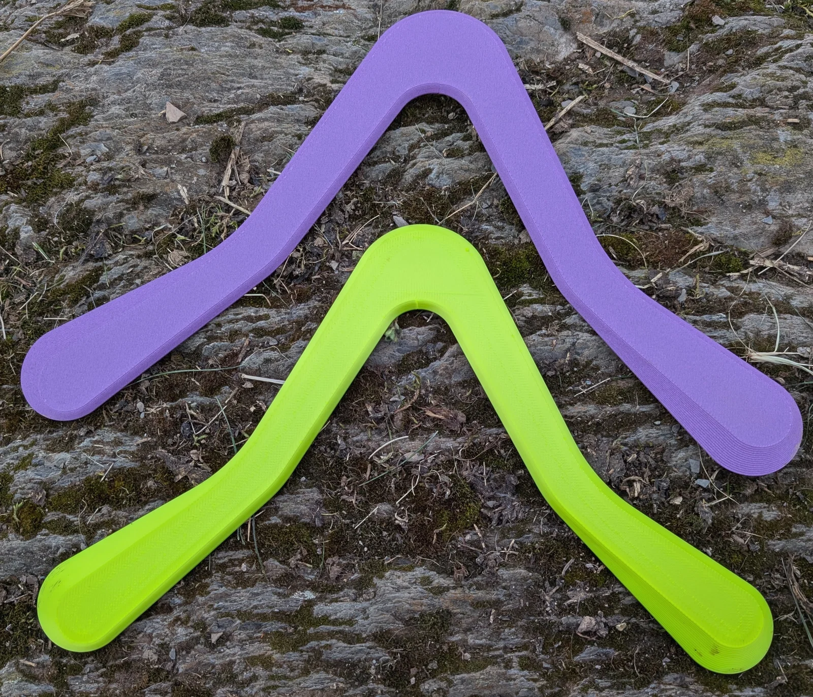 Chiếc màu vàng trong hình được in khá đặc với nhiều lớp top/bottom cũng như số lượng perimeters dày, giúp nó bay được khoảng 40 mét. Chiếc màu tím thì nhẹ hơn nên bay với khoảng cách gần hơn một chút.