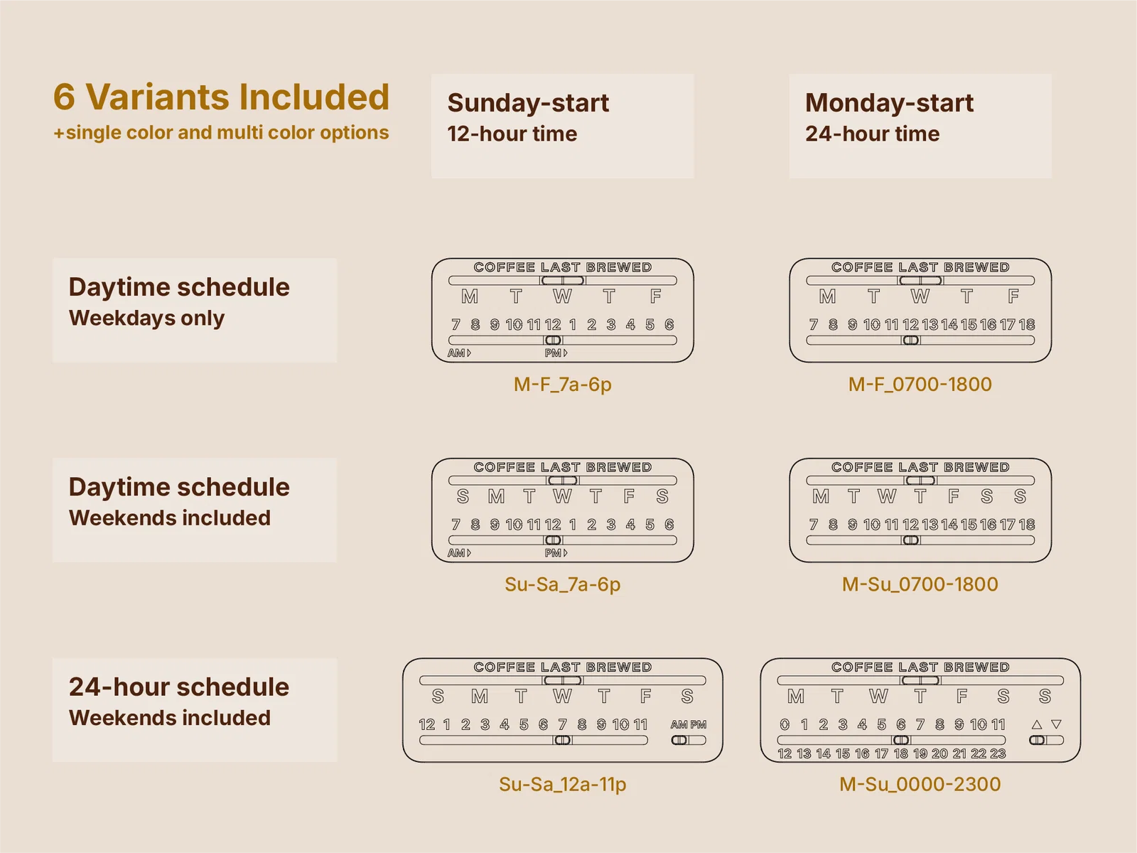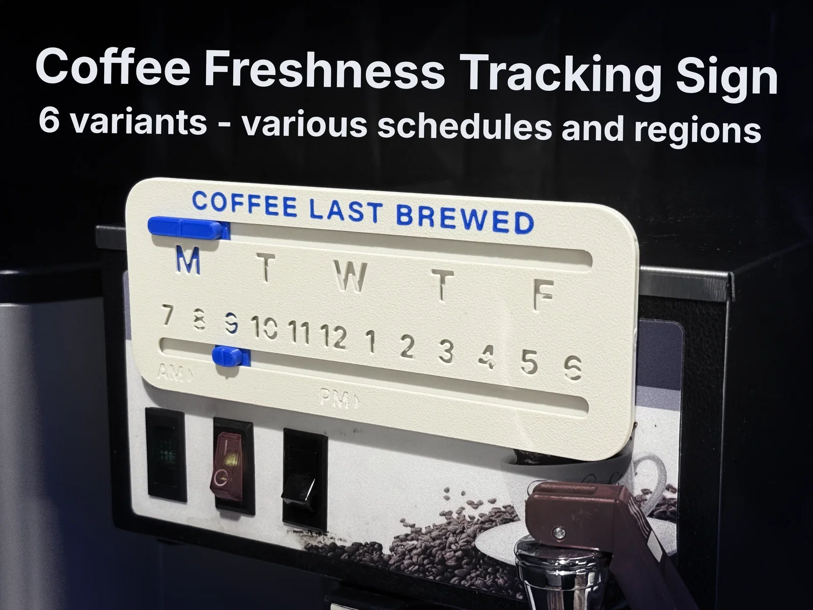 Mình thiết kế cái bảng này cho văn phòng vì đã quá ngán cảnh phải uống cà phê để từ hôm qua. Cách dùng rất đơn giản, bạn chỉ cần gạt thanh trượt mỗi khi pha mẻ mới. Mình có đính kèm nhiều biến thể để phù hợp với các lịch trình hoặc định dạng ngày tháng khác nhau. Hy vọng mọi người thích nhé!