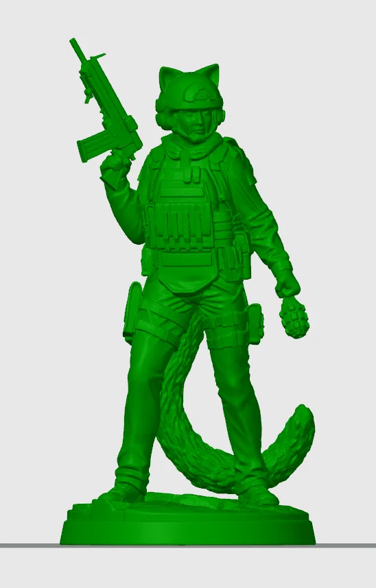 Kết hợp giữa những đặc điểm của loài mèo và trang bị quân sự hiện đại chuẩn xác, mô hình cat-man chiến thuật này là một tay súng cực kỳ chi tiết, sẵn sàng cho mọi trận chiến. Nhân vật được trang bị áo giáp chống đạn (plate carrier) với các túi đựng đồ tích hợp, tay cầm chắc khẩu carbine, tay còn lại lăm le quả lựu đạn. Thiết kế này kết hợp thành công các đặc điểm độc đáo như khe hở cho tai mèo trên mũ bảo hiểm và phần đuôi to, đầy chi tiết, đồng thời làm nổi bật phong cách chiến đấu đầy nghiêm túc. Đây là mẫu mô hình hoàn hảo cho những người chơi wargame trên bàn, những ai thích xây dựng sa bàn quân sự hoặc các nhà sưu tầm đang tìm kiếm một hình tượng chiến binh độc bản với phong cách phá cách đầy ấn tượng.