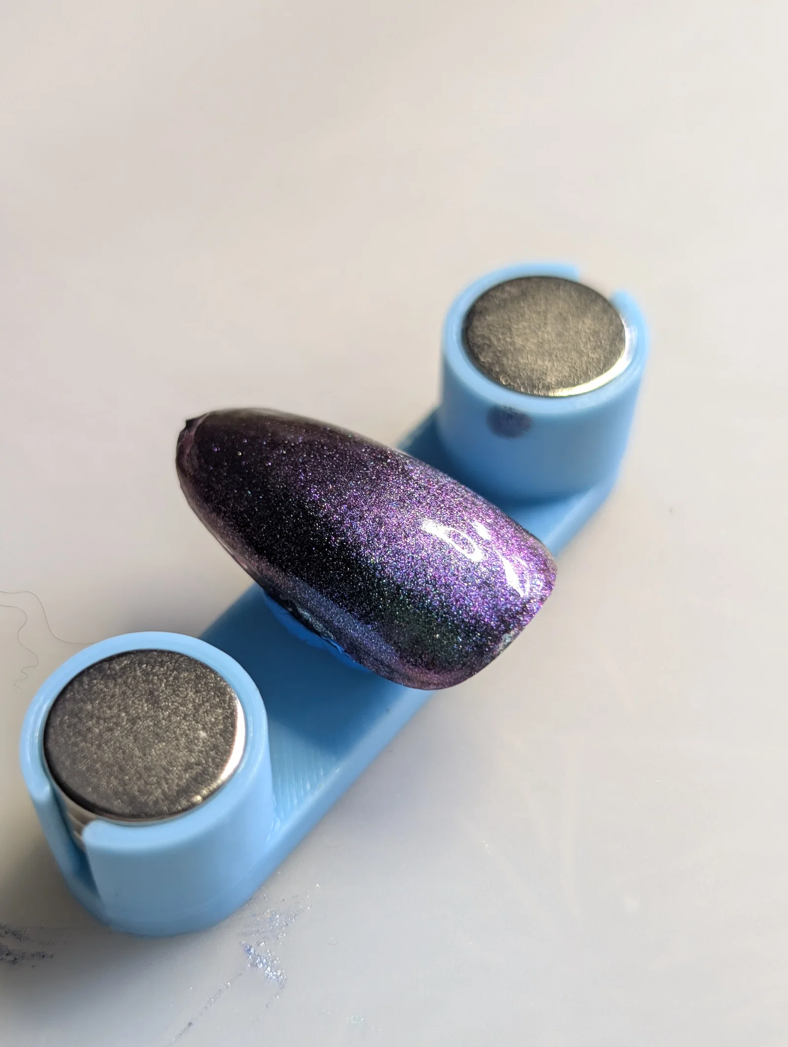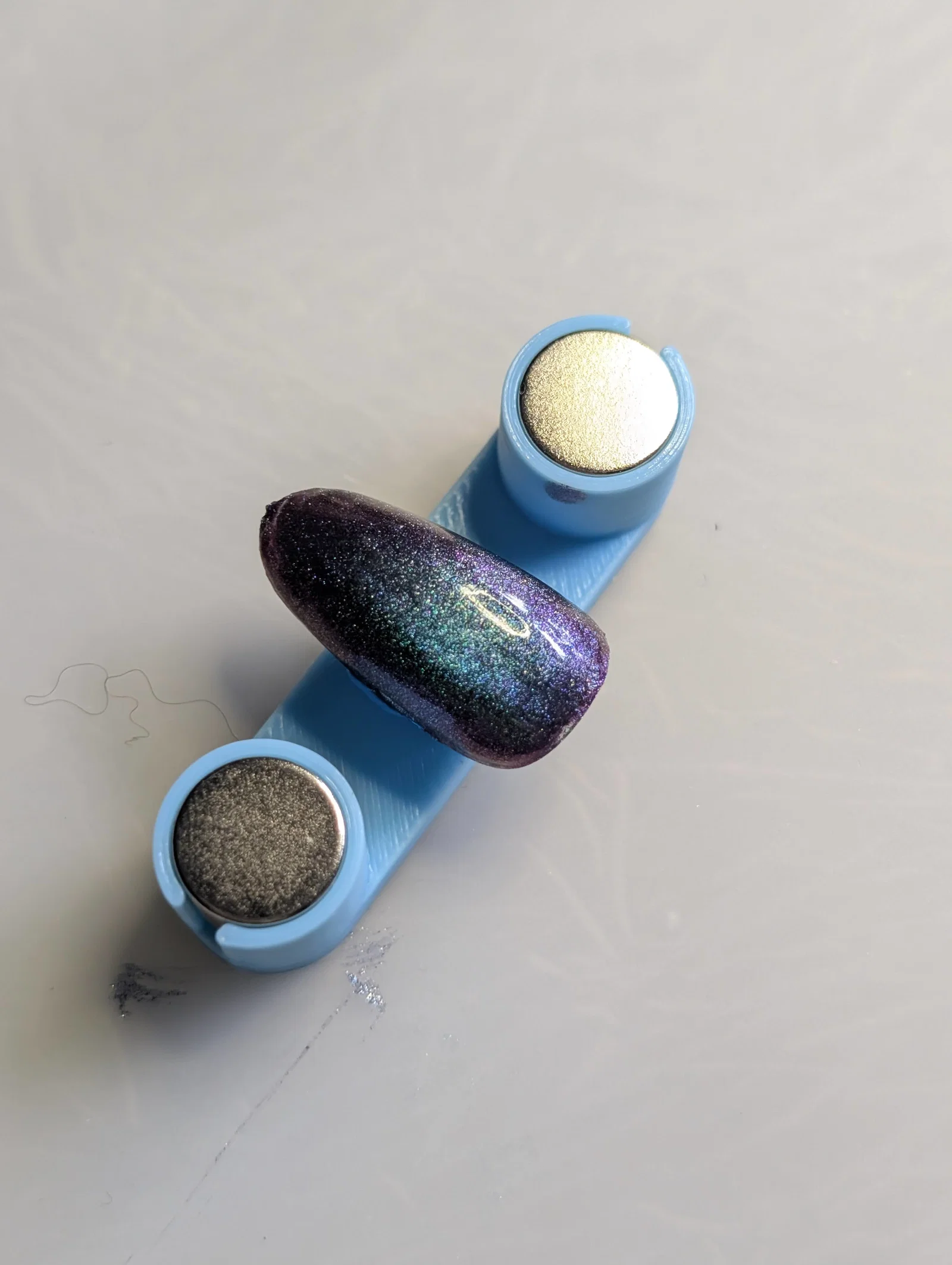 Thiết kế này dùng để giữ nam châm cho hiệu ứng sơn móng tay nhung (velvet effect). Phù hợp cho ngón tay có độ rộng lên đến 22mm. Mình thiết kế cái này theo yêu cầu vì ở một số nơi khó tìm mua loại nam châm thanh dài. Dù hiệu ứng tạo ra sẽ nhẹ hơn so với dùng nam châm thanh, nhưng vẫn dùng tốt. Mình cũng có chừa sẵn lỗ để bạn có thể dùng chung với mẫu phụ kiện tạo hiệu ứng hạt (bead effect spinner) trước đó.