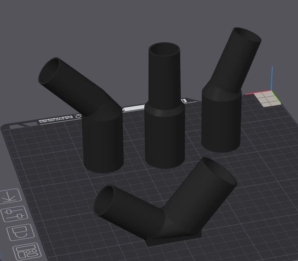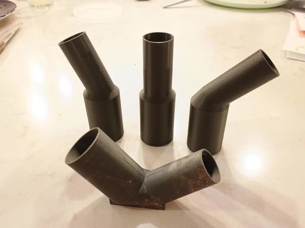 Đây là bộ gồm 4 đầu chuyển đơn giản giúp kết nối máy hút bụi cầm tay DeWalt (hoặc các loại máy hút bụi tương tự có đường kính ngoài của phụ kiện là 1.25 inch) với ống luồn dây điện PVC 1 inch Schedule 40. Chỉ cần lắp khớp ma sát là bạn đã có một kết nối đủ kín để hút dây mồi qua một đoạn ống (đã kiểm nghiệm thực tế với độ dài 25 feet cùng 2 co 90 độ). Tất cả các chi tiết này đều có thể in mà không cần support. Mình đã thử in không cần brim nhưng tùy vào máy của bạn, mình vẫn khuyên dùng brim để bản in được ổn định nhất.