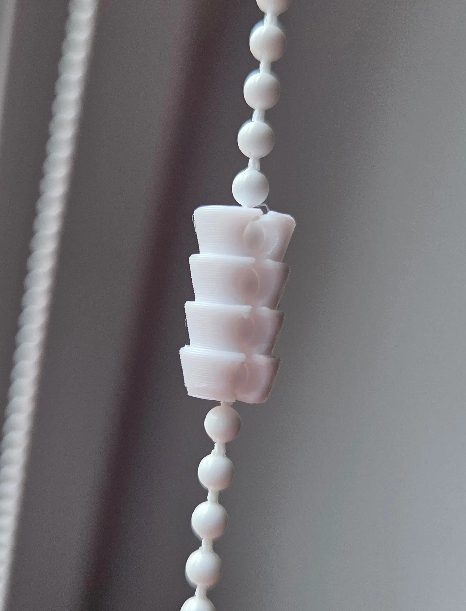 Phụ kiện nhỏ gọn giúp chặn dây kéo rèm dạng hạt (phù hợp với loại hạt 3mm, khoảng cách 1mm). Thiết kế snap-fit dễ lắp đặt, có 3 tùy chọn độ khít để bạn in thử và sử dụng cho rèm cửa của mình.