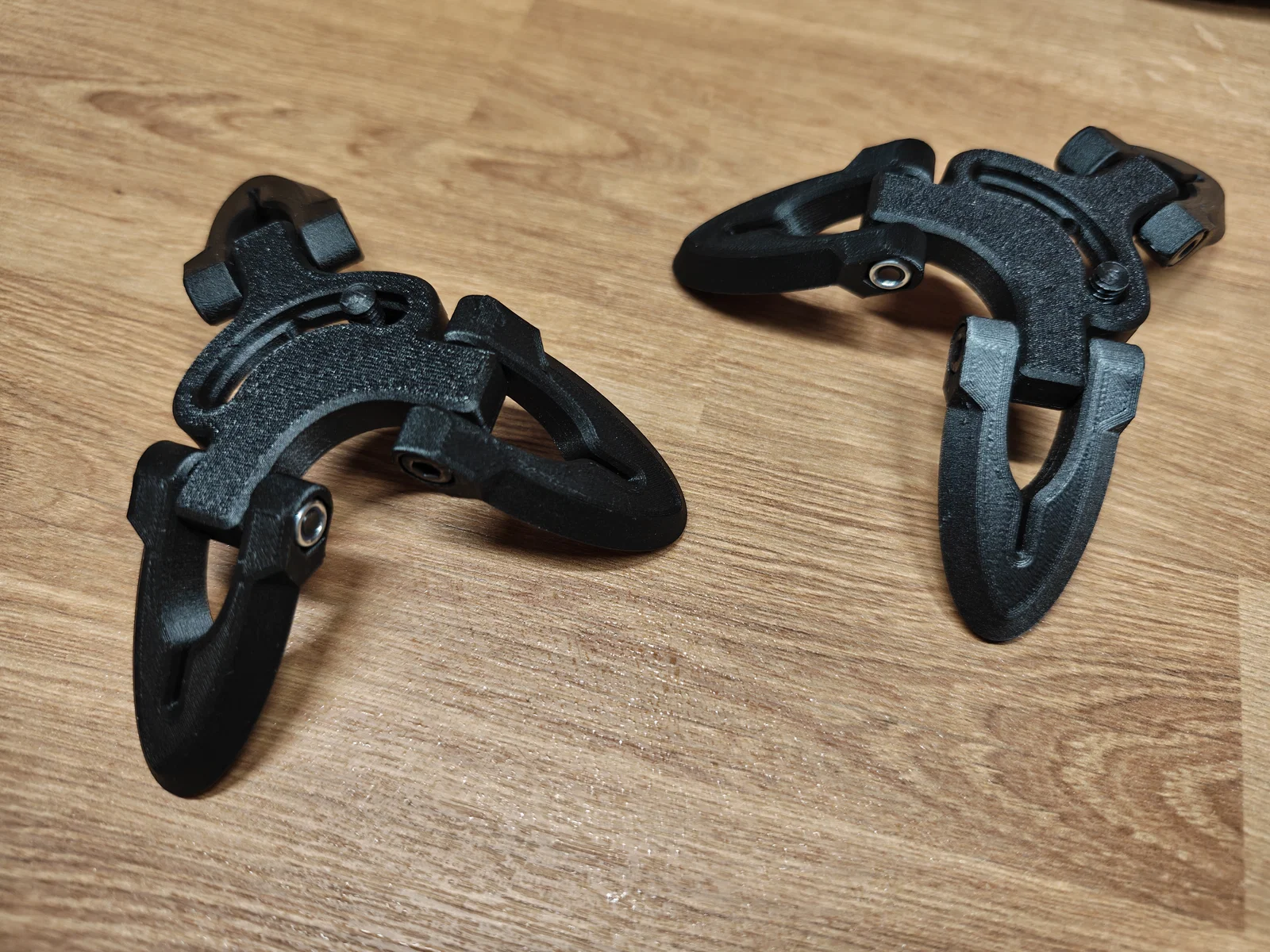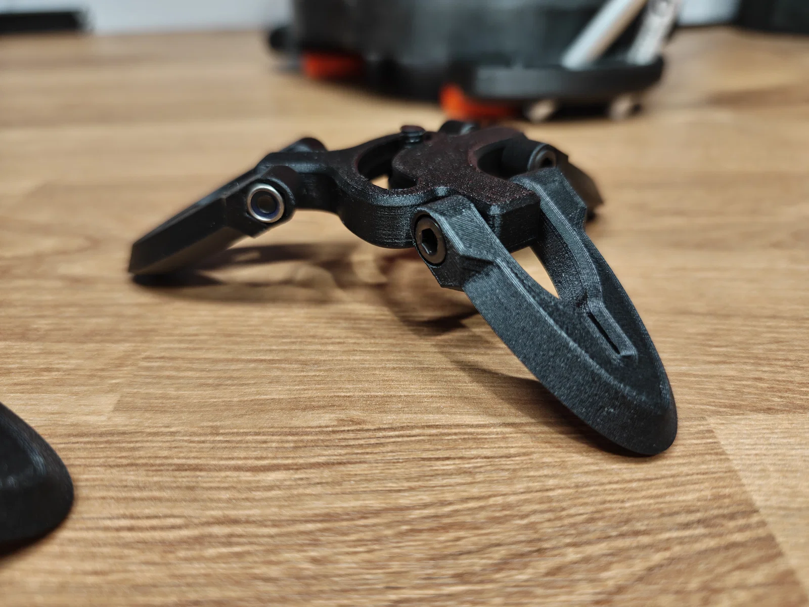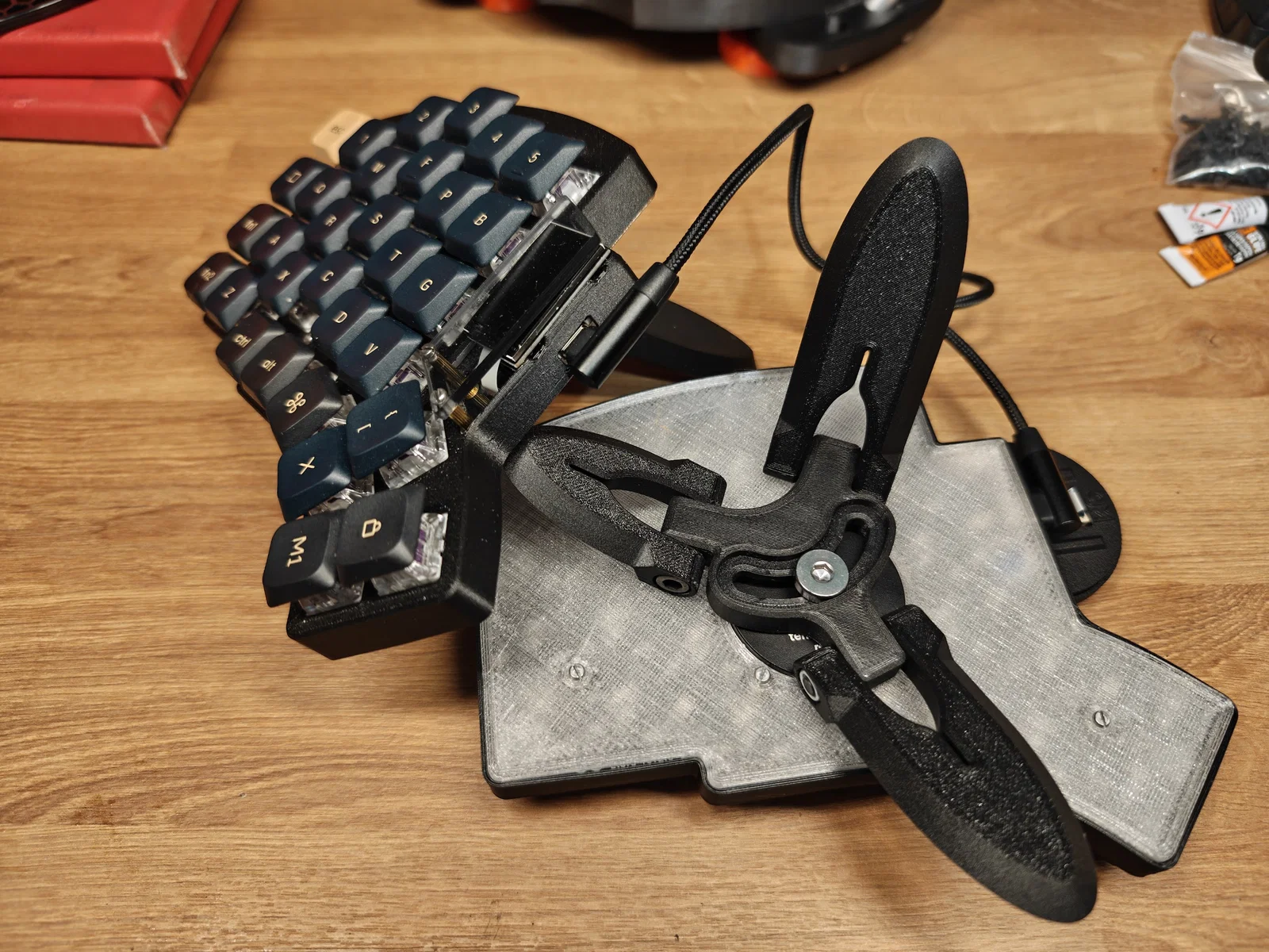 Vỏ case được bán dưới dạng mô hình riêng biệt. Mình thiết kế bộ này để đặt chiếc Halcyon Elora của mình vào vị trí thoải mái hơn. ### Các vị trí Bộ kit này khá linh hoạt nhờ vào khe gắn và khả năng tùy chỉnh nhiều góc độ. Ví dụ, hình bên phải là vị trí mặc định, trong khi với Elora, mình thấy vị trí bên trái thoải mái nhất - chân ngoài cùng để phẳng (không dùng) và hai chân trong xòe rộng để tăng độ vững chãi: ### Phần cứng Ban đầu mình thiết kế dựa trên một loại ốc tìm được trên Amazon Ba Lan, nhưng sau đó không tìm thấy trên Amazon.com. Đó là lý do tại sao có hai phiên bản: ##### Captive (Có khóa) In file tenting_tripod-tripod_base-PETG và dùng loại ốc này: amazon.pl. Mình cũng đính kèm mô hình của con ốc đó, bạn có thể tự in nếu máy in của bạn làm mát đủ tốt. ##### Non-captive (Không khóa) Mình thấy bản này không bằng bản trên nhưng về thực tế công năng vẫn như nhau. Dùng file tenting_tripod-tripod_base_no_slot-PETG kết hợp với loại ốc này: amazon.com. ##### Ba độ dài chân Chọn một trong 3 kích thước: 54mm, 69mm, 84mm. Trên con Elora, cuối cùng mình dùng kết hợp mỗi loại một chiếc cho mỗi bên. ##### Linh kiện chung Cho một chân đế với 3 chân trụ, bạn cần: 1x ốc vít đã nêu ở trên 3x ốc lục giác M5 25mm * 3x đai ốc lục giác M5 Dưới đây là một số kích thước - hy vọng sẽ giúp bạn xác định xem thiết kế này có tương thích với bàn phím của mình hay không. ### In ấn Hãy đặt nằm các chi tiết khi in. Mình thiết kế dựa trên độ cao lớp in 0.3mm, nên bạn hãy dùng thông số này hoặc thấp hơn để đạt chất lượng tốt nhất. Mình đã in bản cuối cùng với độ cao lớp 0.12mm bằng nhựa Fiberlogy PETG Matt. Ngoài ra, mình khuyên không nên dùng PLA vì nó có thể bị biến dạng theo thời gian.