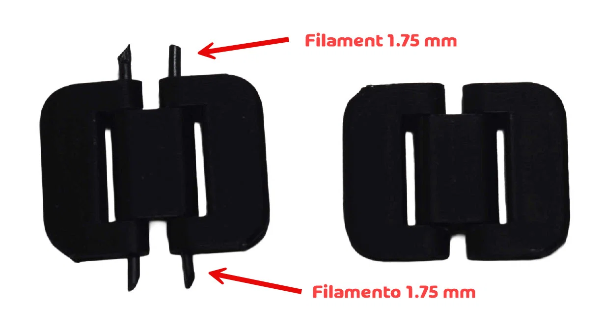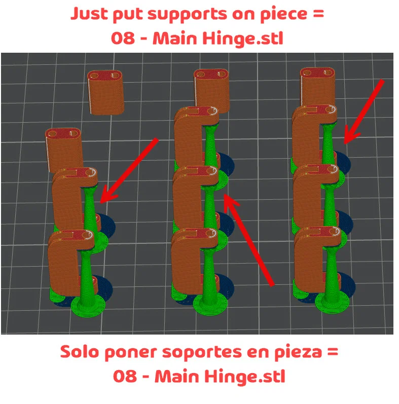 Các bản lề (x4) hoạt động bằng đoạn nhựa 1.75mm (nếu thấy đoạn nhựa bị lỏng, bạn có thể dùng keo dán lại); bạn chỉ cần thêm support cho chi tiết = 08 - Main Hinge.stl.