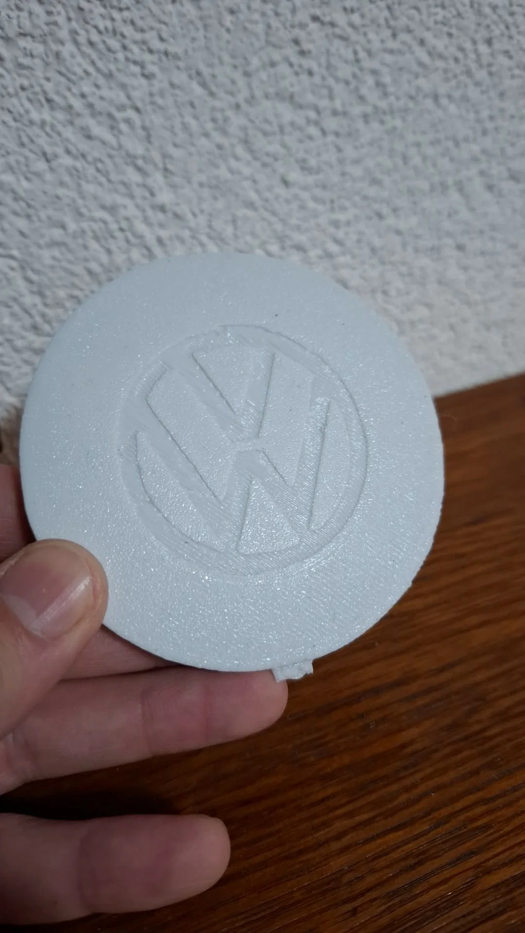 Mình đã in với mặt logo VW úp xuống bàn mà không dùng support, vì mình muốn bề mặt có vân trông đẹp hơn. Lúc đó mình không có sẵn nhựa đen nên đã in bằng nhựa trắng rồi sơn thêm một lớp lót nhựa (plastic primer). Mình cũng có đính kèm file GCODE sẵn sàng để in luôn nếu bạn cần nhé.