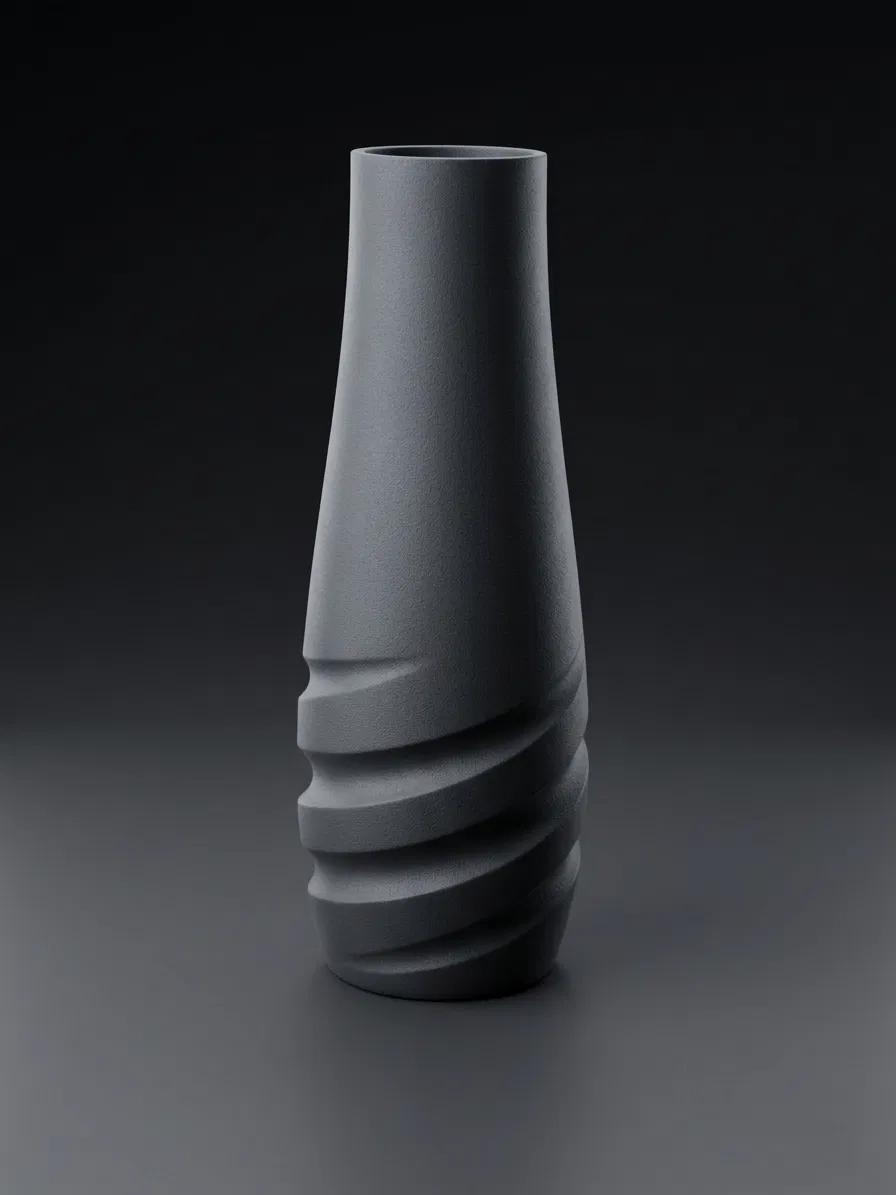 Một chiếc bình hoa hiện đại, tối giản với phần thân trên trơn láng và phần đế xoắn ốc đầy nghệ thuật. Được thiết kế chuyên biệt cho việc in 3D thẩm mỹ và trang trí nội thất.