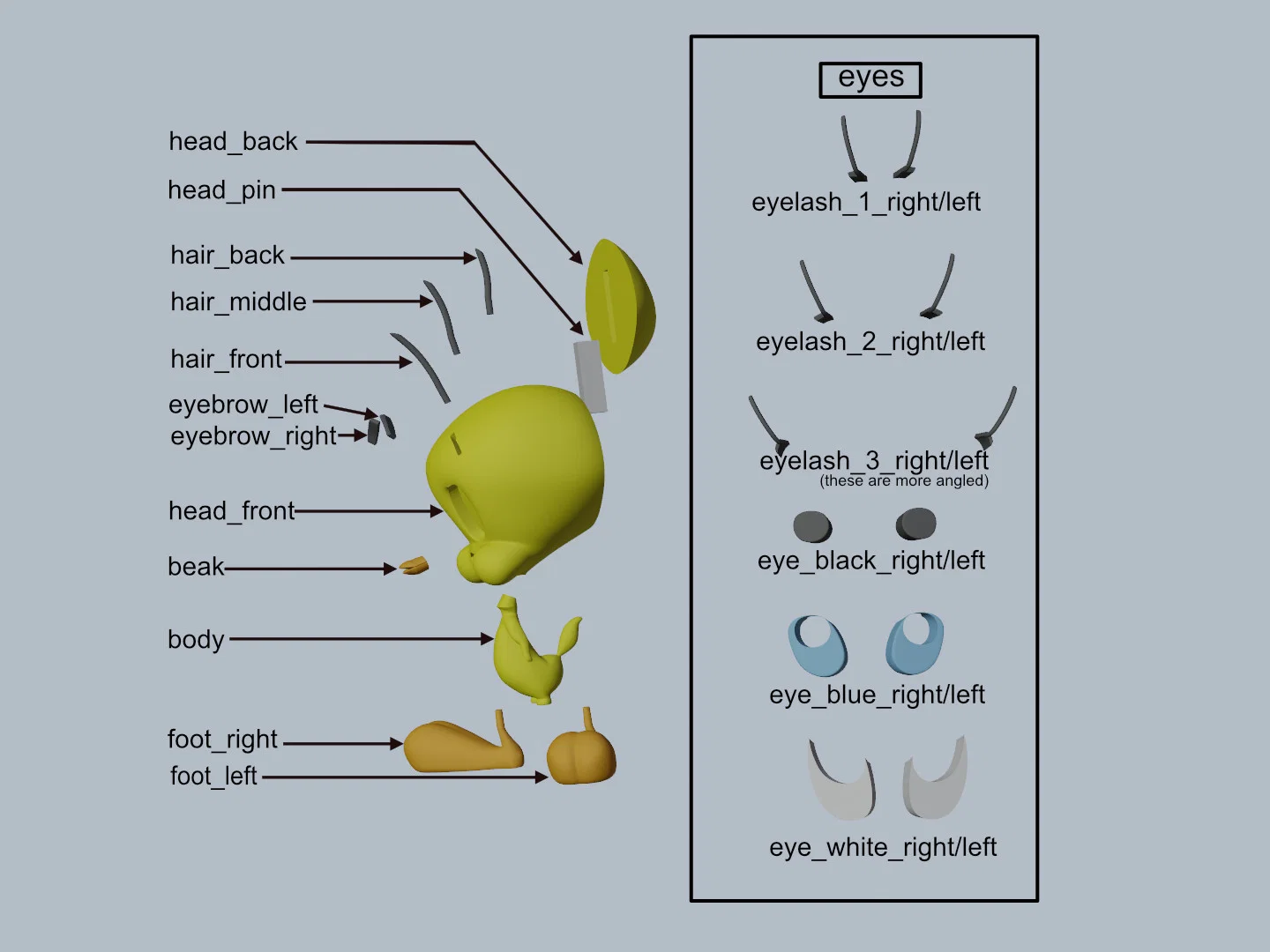Vàng (PLA): body, head_front, head_back, head_onepiece (tùy chọn để in nguyên đầu)