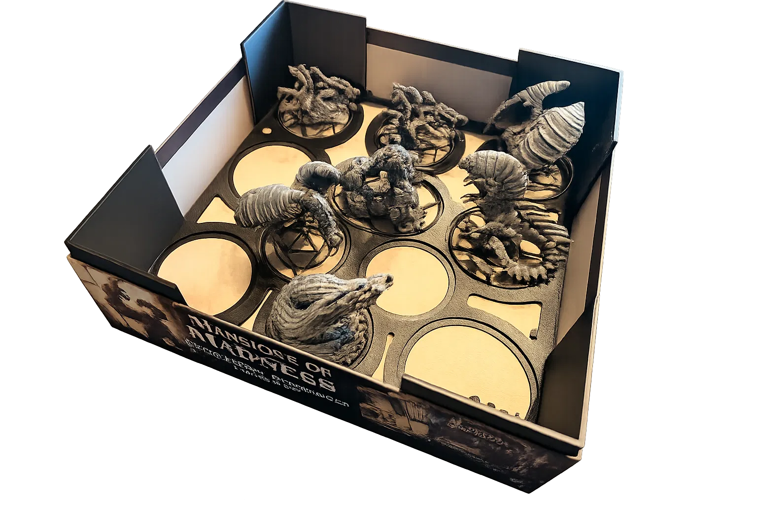 Mình đã remix lại một trong những bộ insert từ dự án của Tibor555, do phần insert dành cho mấy con quái vật lớn khiến cho nắp hộp không thể đóng kín được nếu không muốn làm hỏng mô hình. Mình đã bổ sung thêm phần nâng nắp (lid risers) và nó hoạt động hoàn hảo.