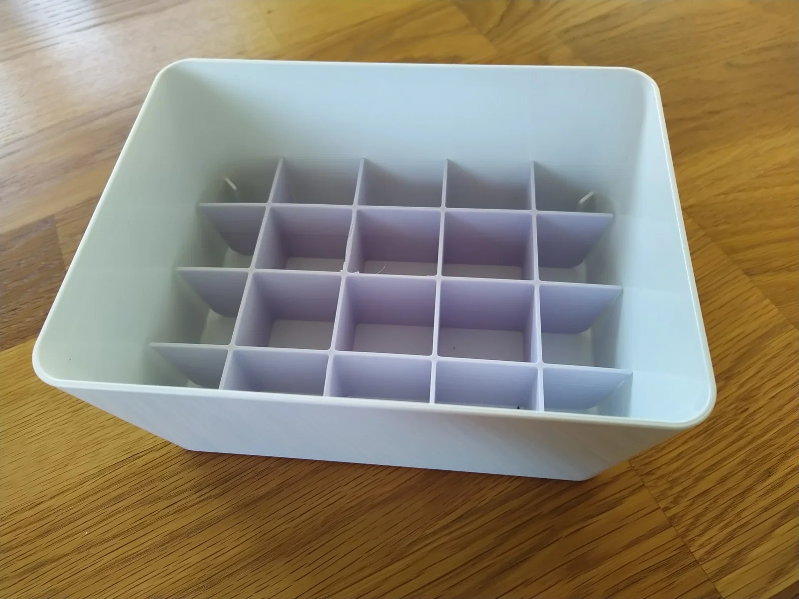 Bạn đang sở hữu hộp IKEA Kuggis nhưng chưa biết cách sắp xếp đồ đạc bên trong cho ngăn nắp? Hãy thử ngay bộ khay chia ngăn in 3D chuyên dụng với cấu trúc 5x4 tiện lợi này. Thiết kế được tính toán chuẩn xác cho hộp Kuggis kích thước 130x180x80mm, giúp phân chia không gian hiệu quả cho linh kiện nhỏ, ốc vít, phụ kiện trang sức hay vật dụng văn phòng. Với chiều cao 35mm, khay chia này vừa vặn hoàn hảo, giúp đồ đạc cố định, không bị xáo trộn. Đây là giải pháp in 3D tối ưu, tiết kiệm chi phí nhưng cực kỳ bền bỉ và thẩm mỹ, biến chiếc hộp IKEA của bạn thành một hệ thống lưu trữ chuyên nghiệp. Hãy cùng bắt tay vào in và trải nghiệm sự tiện lợi mà nó mang lại cho không gian sống của bạn ngay hôm nay.