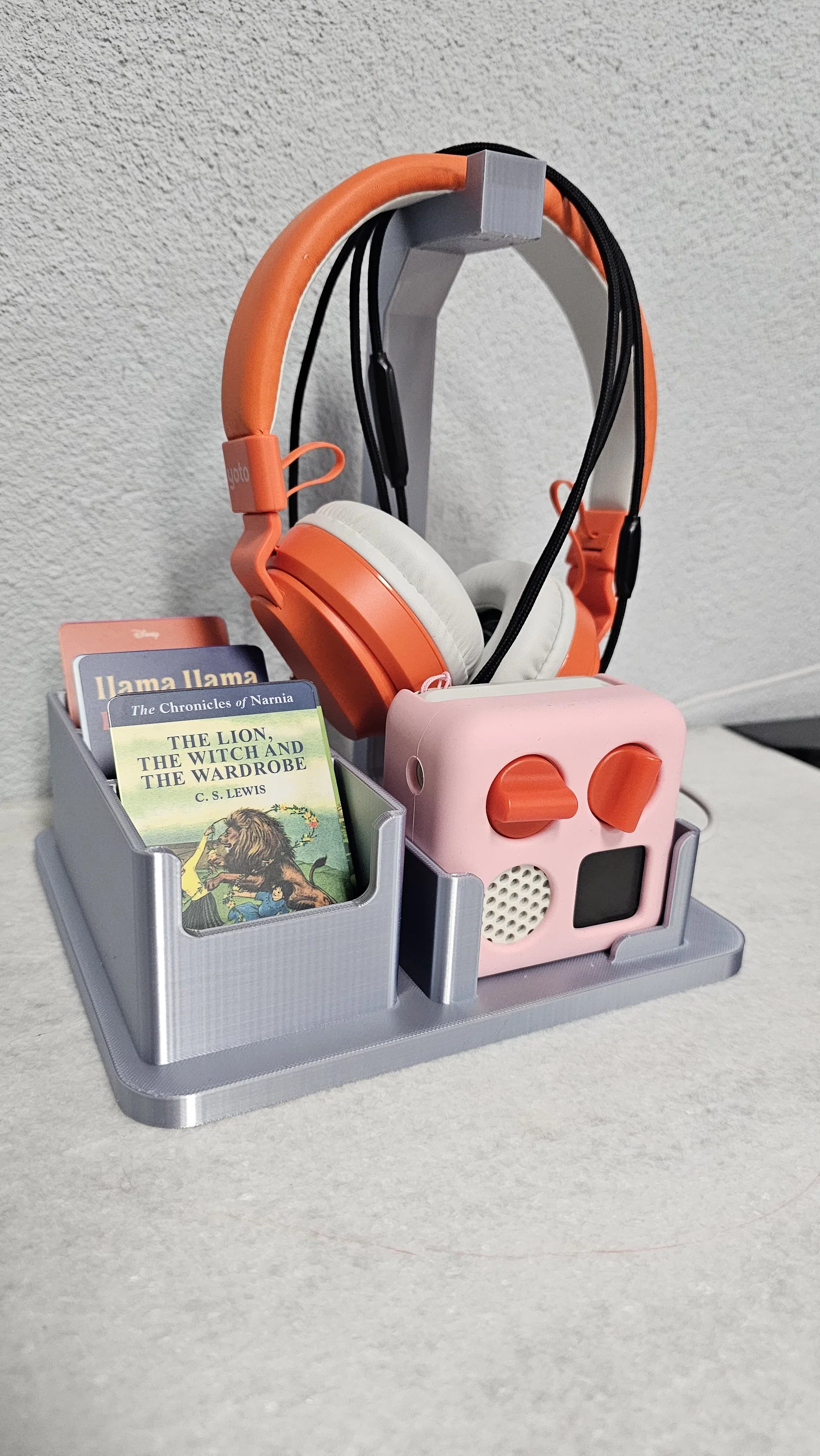 Cả hai đứa nhỏ nhà mình đều dùng máy nghe nhạc Yoto mini và mình thấy rất bực mình vì chúng cứ làm thất lạc máy, tai nghe và thẻ liên tục! Mình có tìm kiếm sơ qua nhưng thấy mấy mẫu hiện có không đi kèm giá đỡ tai nghe, nên mình quyết định tự tay thiết kế luôn. Hy vọng bạn sẽ thấy thích mẫu này và nó giúp mấy bé nhà bạn giữ đồ đạc gọn gàng hơn một chút nhé.