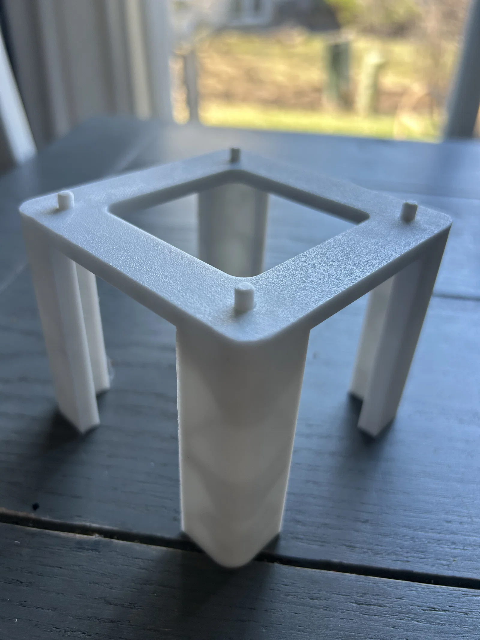 Mình cần nhấc cái router lên khỏi sàn để tạo không gian cho thoáng khí tốt hơn. Mình đã thiết kế cái đế này để khớp với các chốt bên dưới router. Các miếng đệm cao su trên router có thể tháo ra rất dễ dàng. Các chốt này sẽ gắn vào đúng vị trí lỗ mà mấy cái chân cao su đã ở đó. Mình làm các chốt riêng biệt để khi in cái đế có thể đặt mặt xuống dưới. Ba trong số các lỗ trên router có độ sâu ngắn hơn nên bạn có thể cắt chốt cho vừa với kích thước đó nhé.