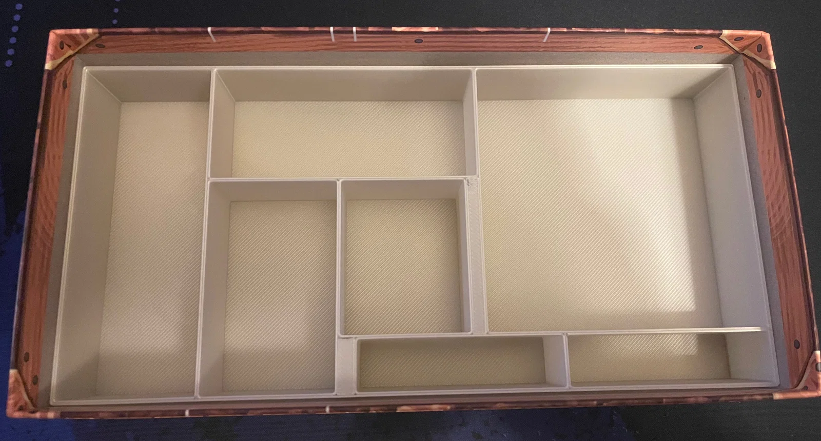 Đây là khay thay thế cho tấm ngăn bằng giấy đi kèm trong hộp thẻ bài. Tấm ngăn cũ rất yếu, hay bị cong, làm thẻ bài dễ bị trượt qua cạnh hoặc kẹt lại, nhìn chung là khá tệ. Khay thay thế này có thêm phần gờ bao quanh để giữ thẻ bài chắc chắn hơn, đồng thời có độ dung sai tốt hơn giúp cố định các lá bài, tránh tình trạng bị xáo trộn khi di chuyển. Ngoài ra, mình cũng đã sắp xếp lại vị trí vì không thích việc các lá bài 'action' và 'chest' phải quay theo hướng khác nhau; giờ đây tất cả các lá bài đều được xoay về hướng 'phía trước'. Thiết kế này được tối ưu cho các lá bài có bọc bảo vệ (sleeved) và bao gồm cả không gian cho các gói mở rộng (promo packs), nhưng nếu không có thì vẫn dùng ổn, chỉ là sẽ hơi lỏng một chút. Chỗ để thẻ bài nhỏ thứ hai (mình dùng để đựng objective) vẫn đủ chỗ nếu bạn muốn giữ lại miếng xốp nhỏ đi kèm, nhưng không nhất thiết phải dùng đến nó.