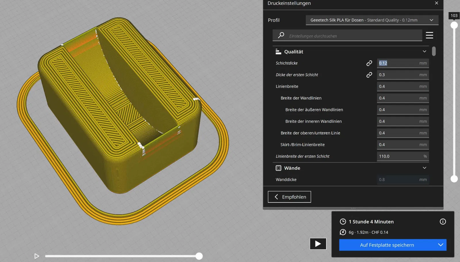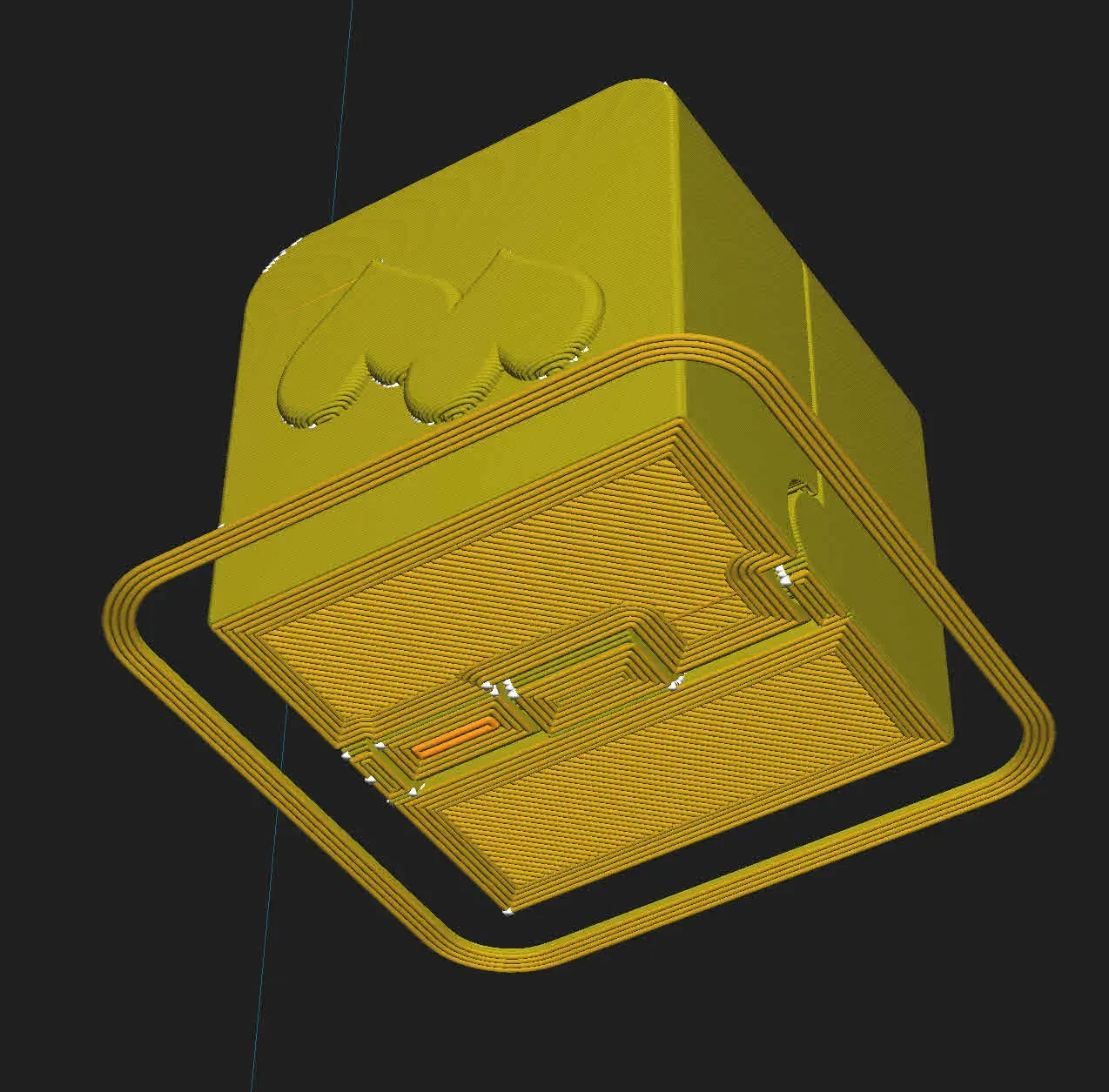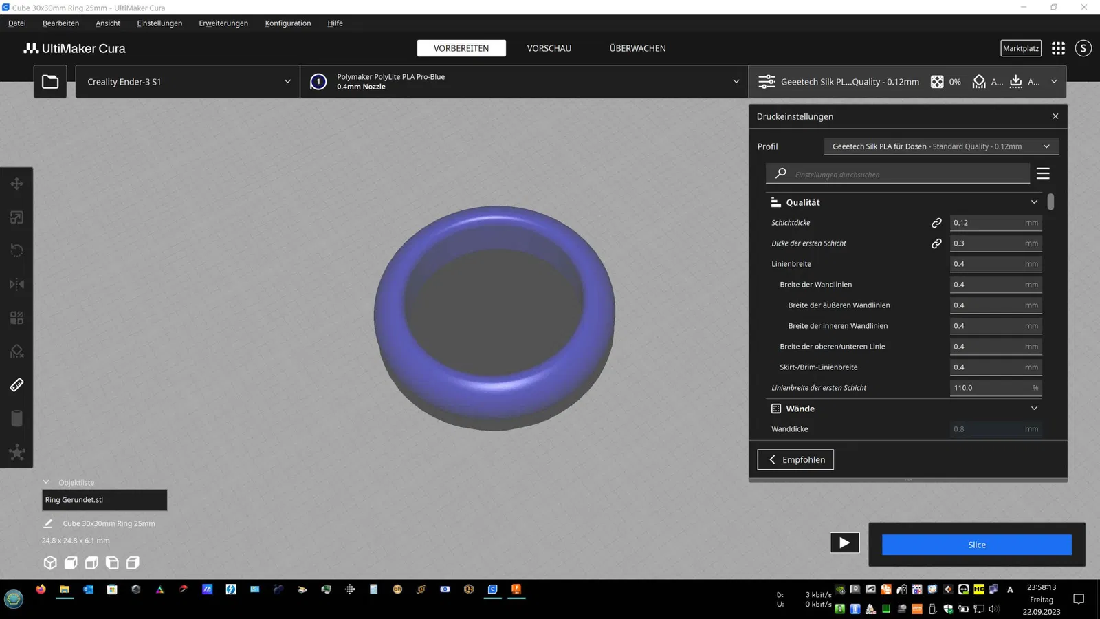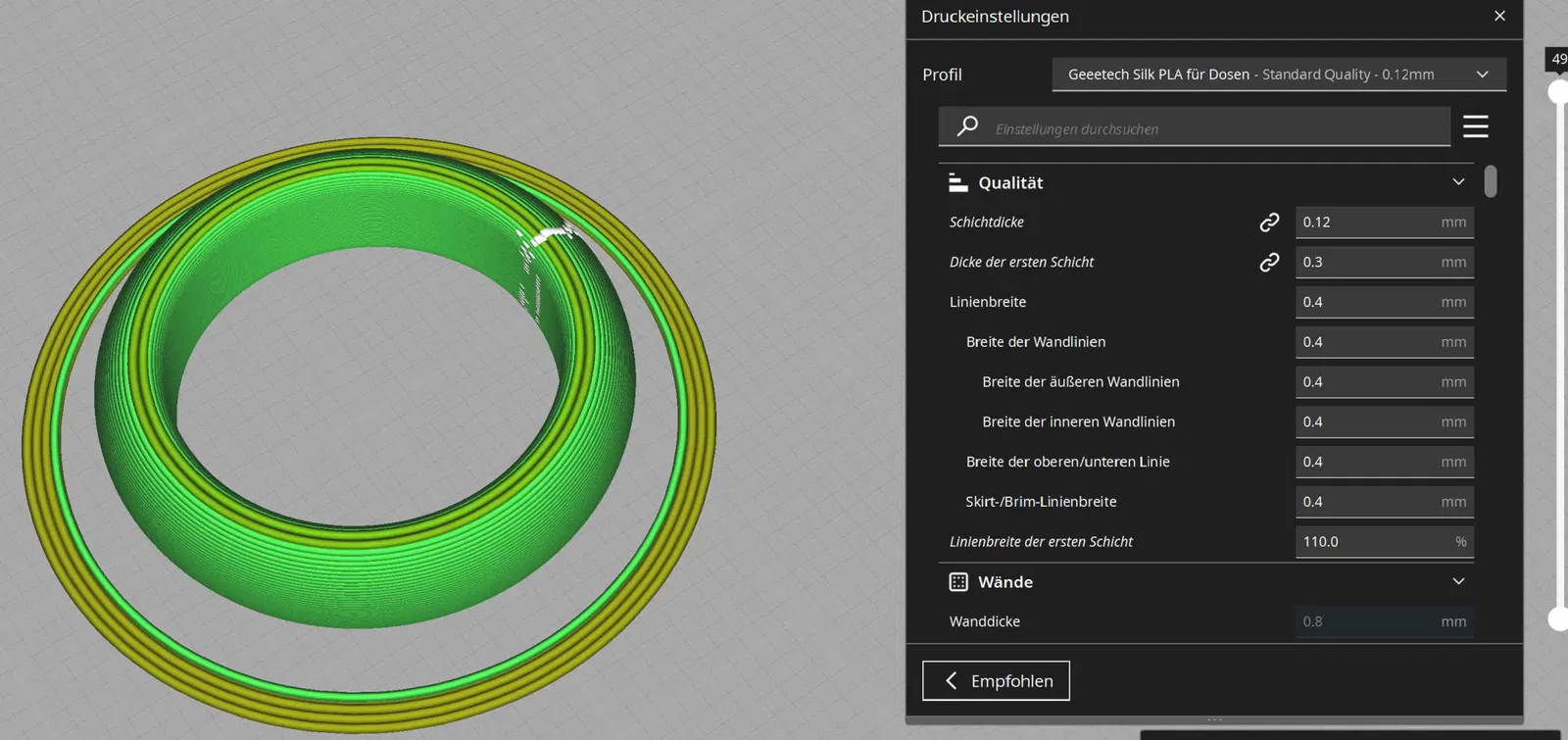 In rất dễ dàng với Silk PLA. Giá đỡ nhẫn bên trong và nhẫn tùy chọn để thử nghiệm với lớp 0.12. Giá đỡ bên trong có thể được thay đổi qua CAD nếu có kích thước nhẫn khác, như độ dày hoặc đường kính (Max D=25mm). Xem tệp eSlicer (3MF).