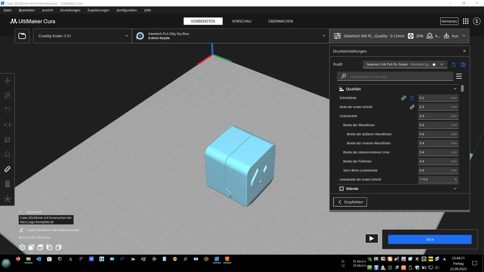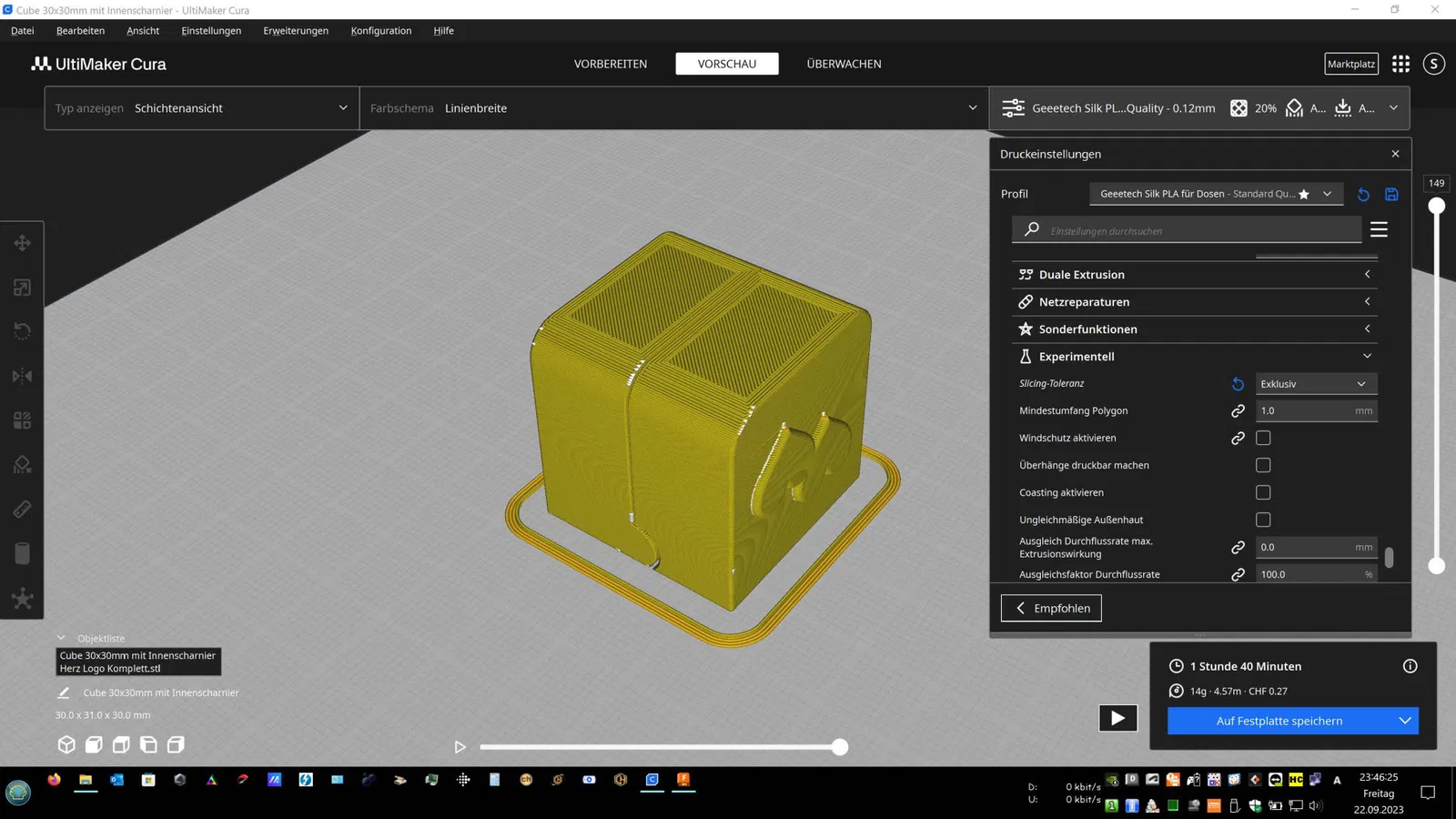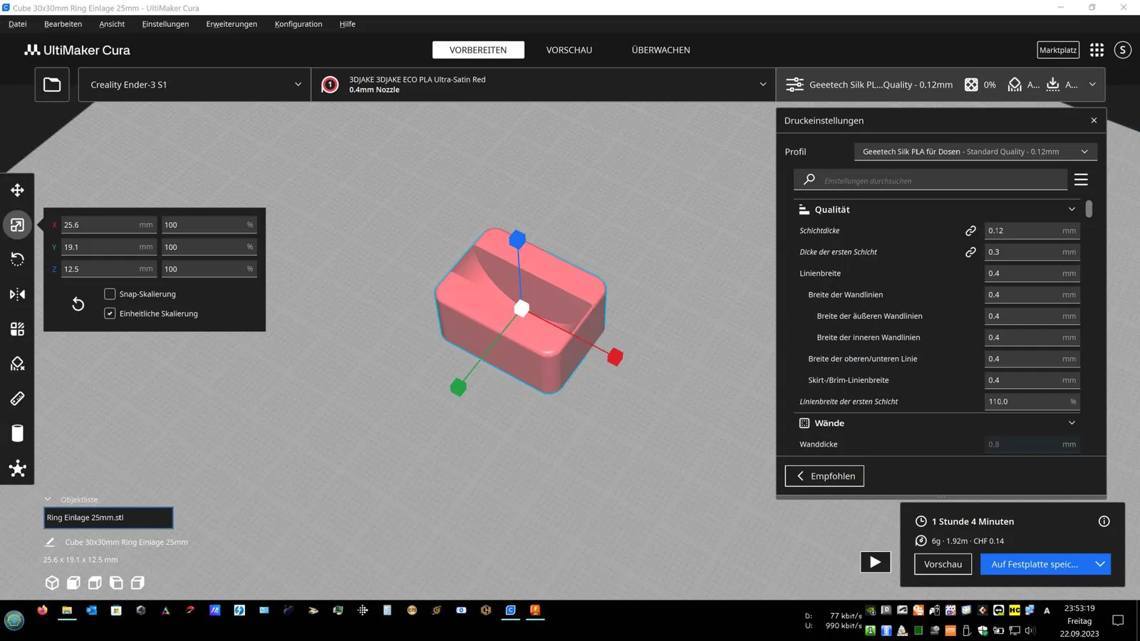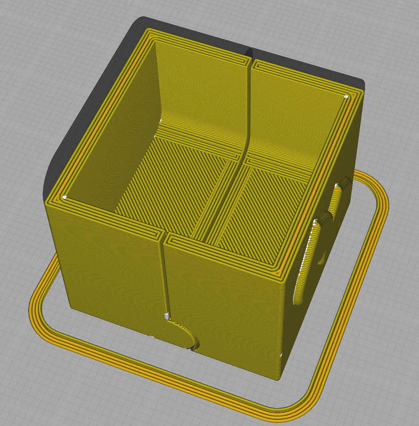 In rất dễ dàng với Silk PLA. Giá đỡ nhẫn bên trong và nhẫn tùy chọn để thử nghiệm với lớp 0.12. Giá đỡ bên trong có thể được thay đổi qua CAD nếu có kích thước nhẫn khác, như độ dày hoặc đường kính (Max D=25mm). Xem tệp eSlicer (3MF).