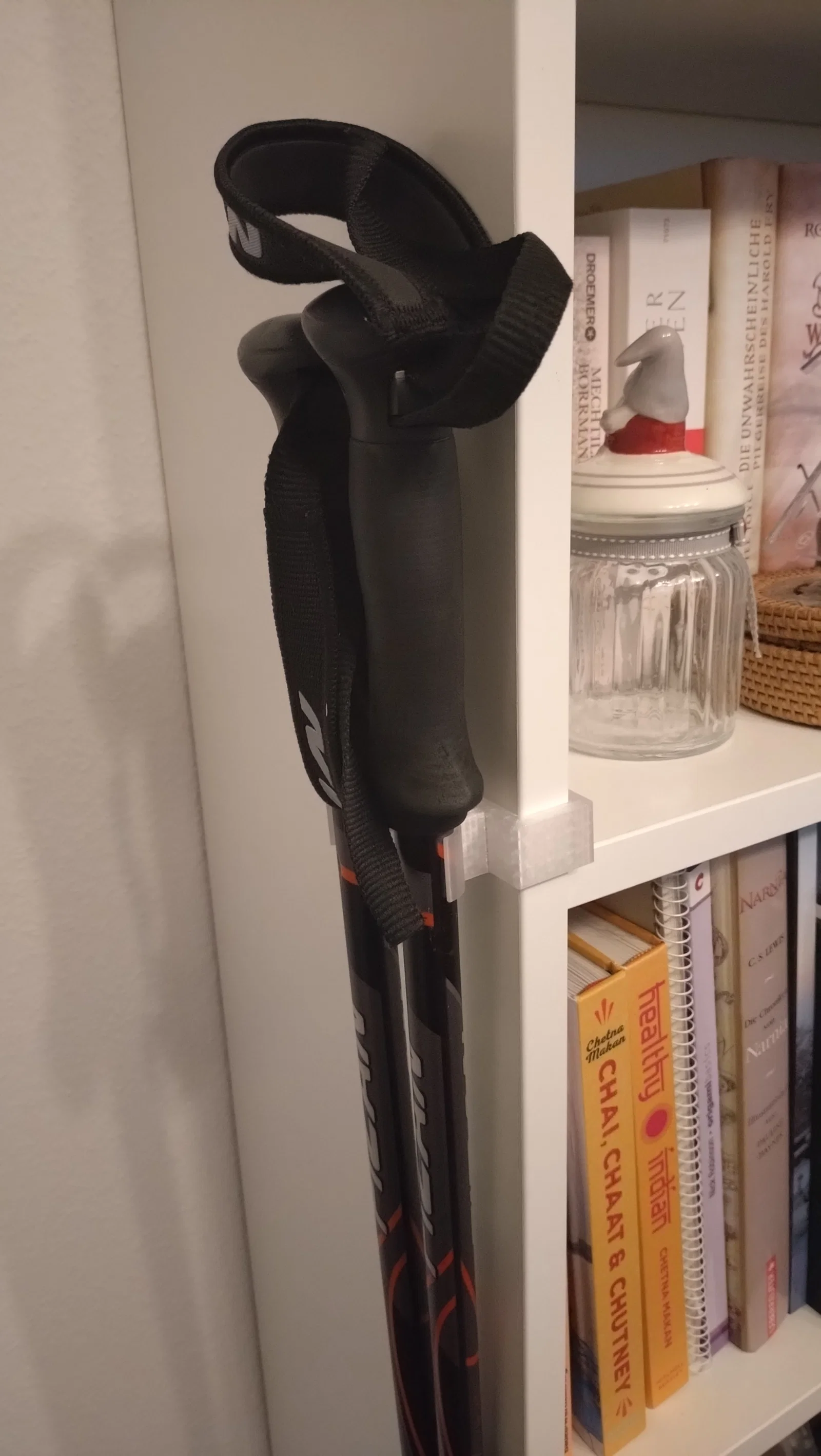 Một giải pháp đơn giản để gắn vào bên hông tủ sách Ikea Billy giúp bạn treo gậy leo núi một cách gọn gàng. Ngàm kẹp có đường kính trong 18mm, tương thích tốt với nhiều loại tay cầm. Bạn có thể in bằng nhựa PETG hoặc PLA đều được.