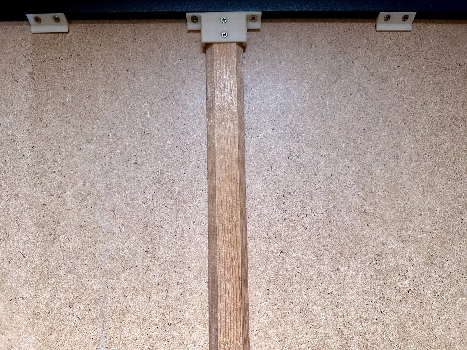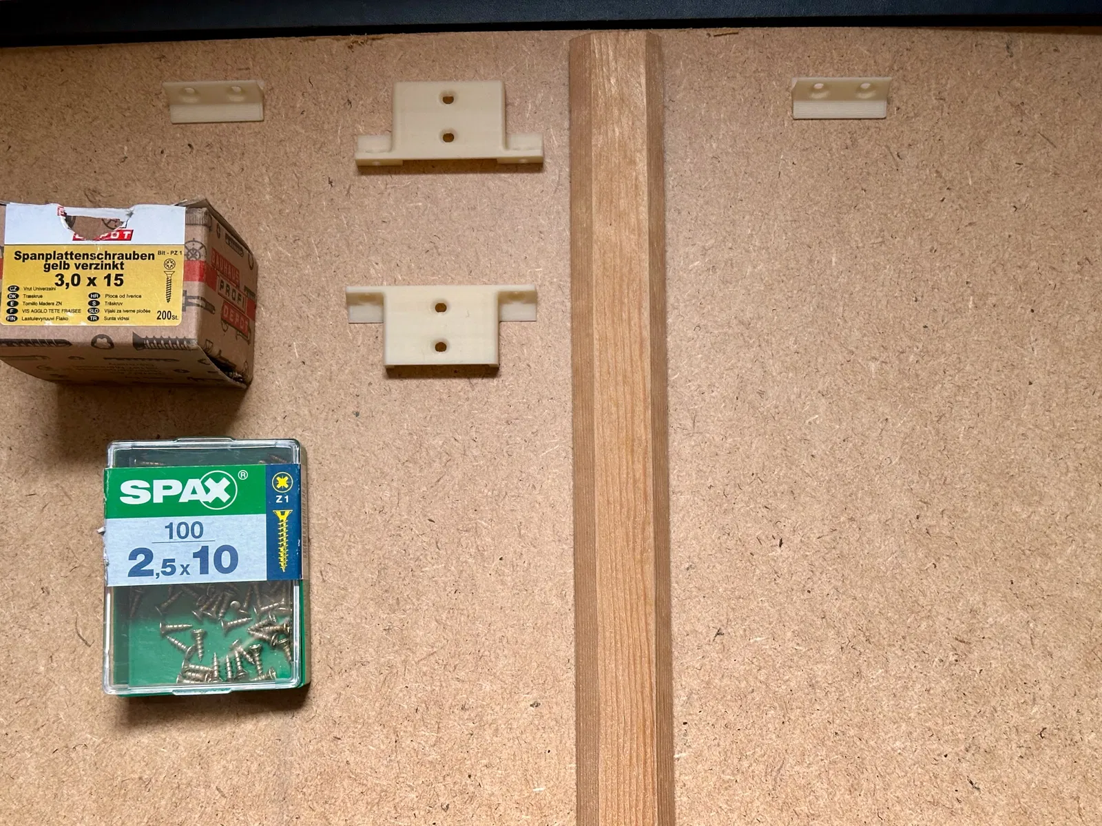 Các lỗ bắt vít được làm nghiêng nên bạn có thể lắp đặt mọi thứ mà không cần tháo rời ngăn kéo. Mình dùng vít 3.0×15 mm để gắn nêm hoặc thanh đỡ chéo vào mặt trước/sau của ngăn kéo, và vít 2.5×10 mm để bắt thanh đỡ chéo vào thanh gỗ.