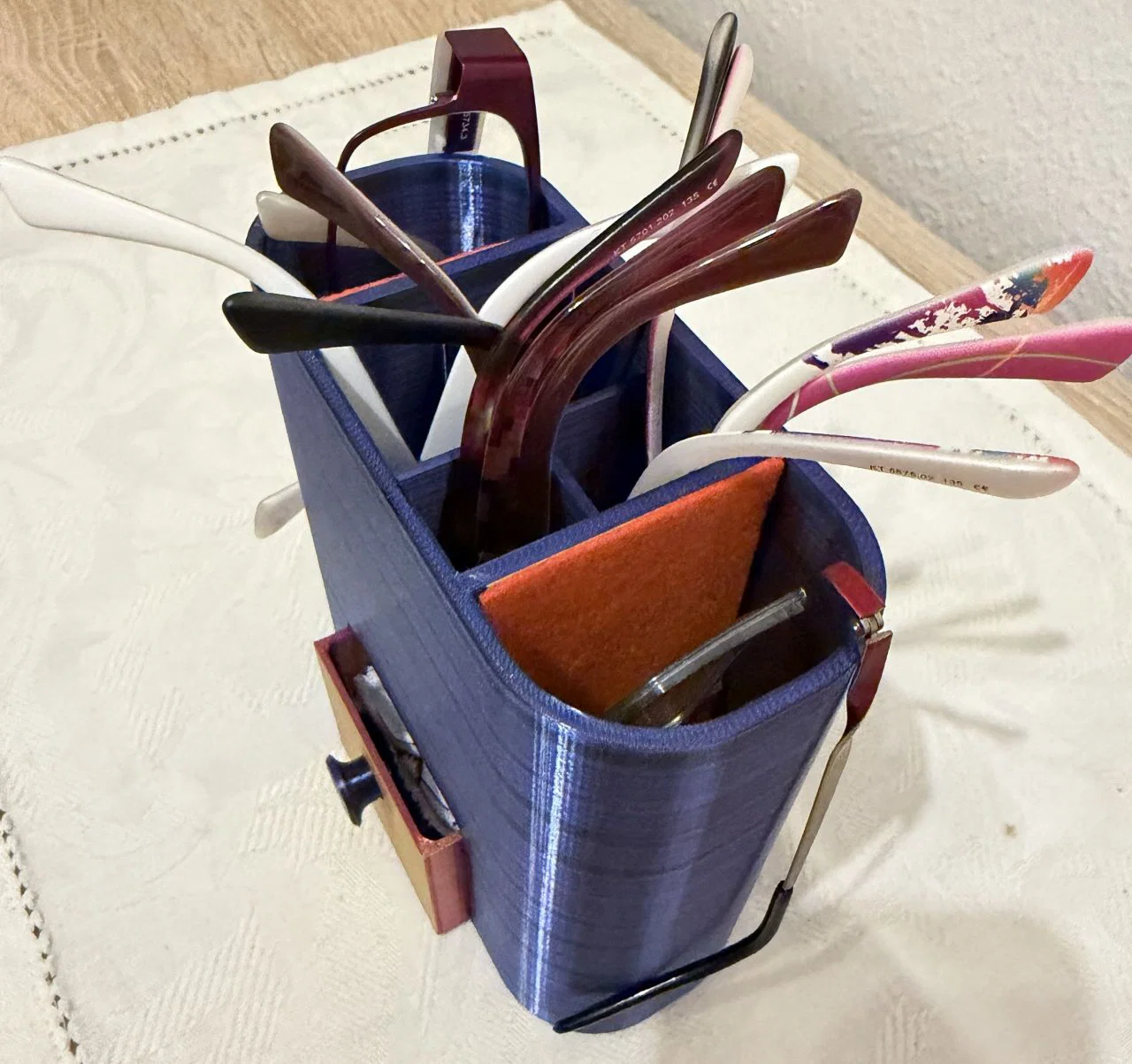 Mình đã tự thiết kế một chiếc hộp đựng kính tiện lợi, có khả năng chứa 2 chiếc kính, gọng dự phòng và ngăn kéo riêng biệt để cất giữ khăn lau kính. Mẫu thiết kế này rất hữu ích và dễ dàng in bằng chất liệu PLA.