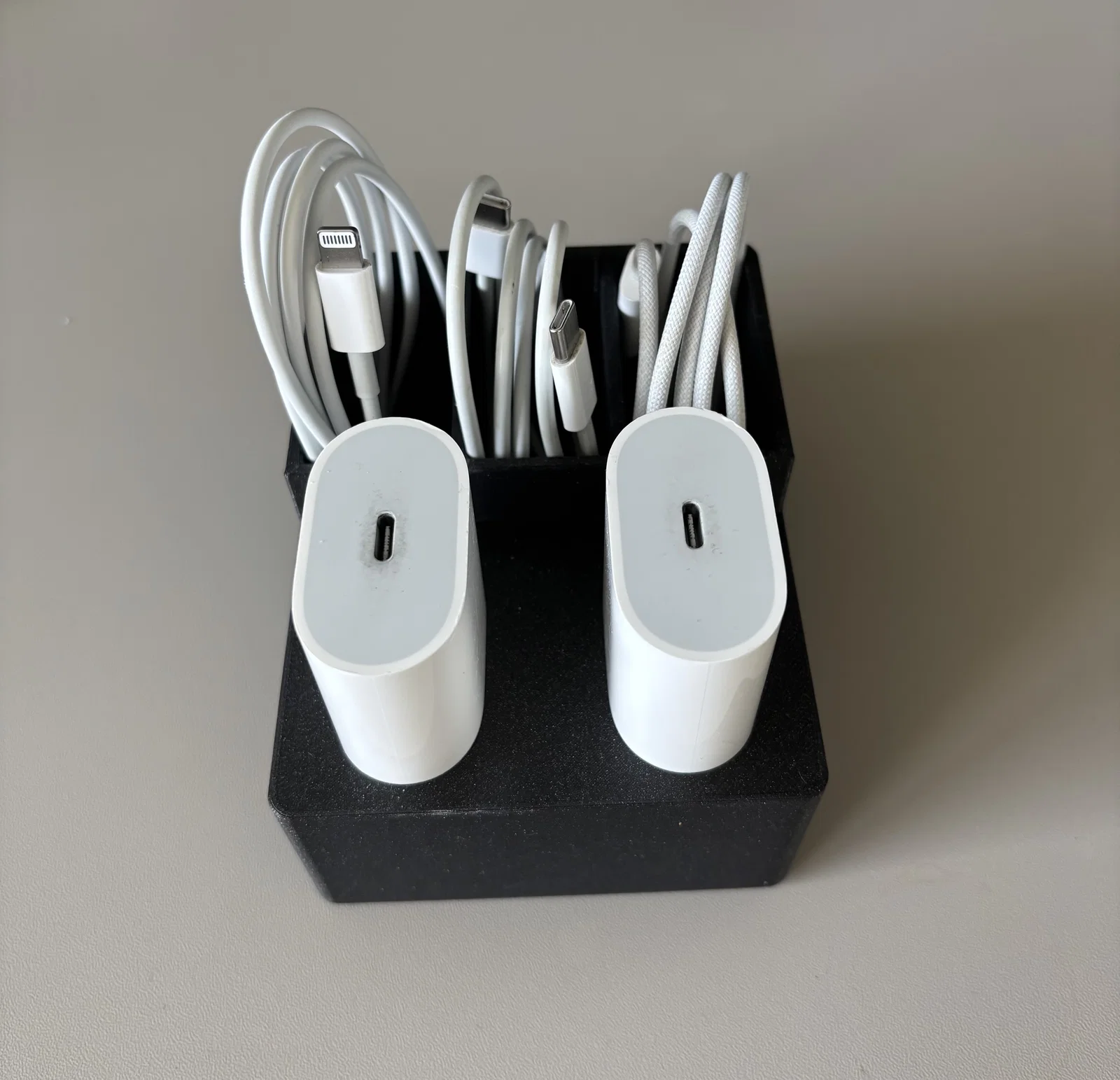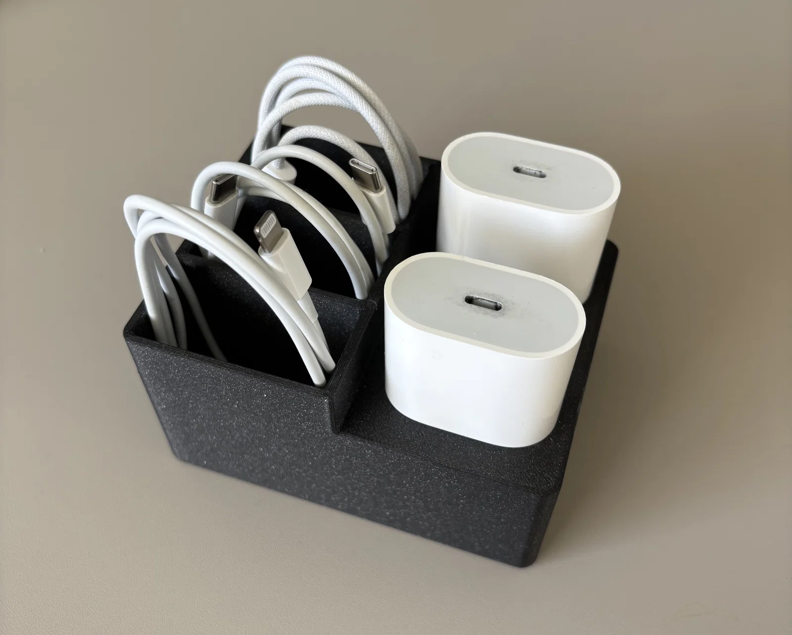 Bạn đang tìm cách dọn dẹp đống dây cáp sạc lộn xộn trên bàn làm việc? Hãy thử ngay mẫu khay đựng bộ sạc và dây cáp Apple (Apple Multi Charger and Cables holder) này. Được thiết kế chuyên biệt để chứa 2 củ sạc và 3 sợi cáp Apple, phụ kiện này giúp không gian làm việc của bạn trở nên gọn gàng, khoa học và thẩm mỹ hơn rất nhiều. Thiết kế tối giản, chắc chắn, in bằng nhựa PLA với thông số 0.2mm layer height và 15% infill sẽ cho ra thành phẩm cực kỳ bền đẹp. Đây là món đồ không thể thiếu giúp bảo vệ phụ kiện Apple của bạn luôn bền bỉ và dễ tìm kiếm mỗi khi cần sử dụng hàng ngày.
