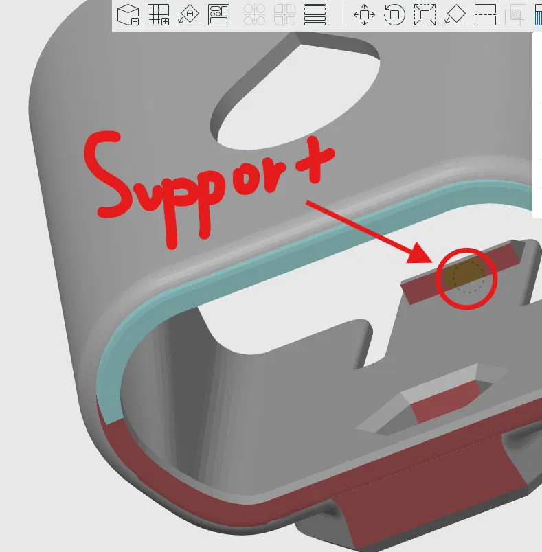 Mô hình được thiết kế để hạn chế tối đa việc sử dụng support. Tuy nhiên, để đạt kết quả tốt nhất, bạn nên thêm một ít support tại phần khía (notch) của file aat_c910_legacy_model_bracket v4 (vui lòng xem hình ảnh minh họa để biết vị trí đặt support gợi ý).