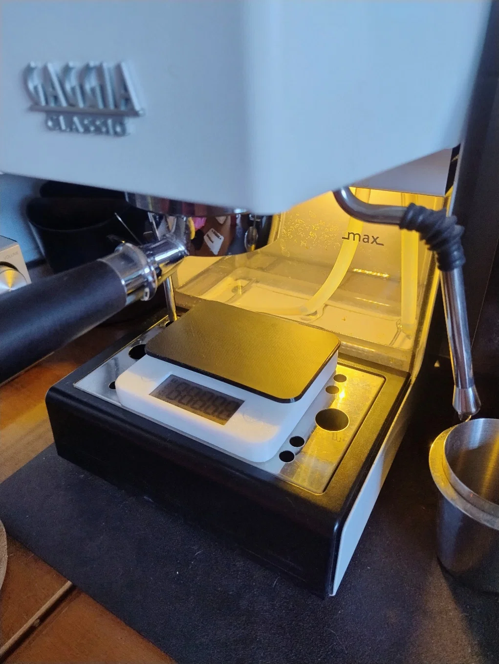 Đây là phiên bản thu nhỏ của mẫu cân bluetooth phổ biến trên AliExpress, được thiết kế để đặt vừa vặn trên khay hứng nước của các loại máy pha cà phê espresso (ví dụ như Gaggia Classic).