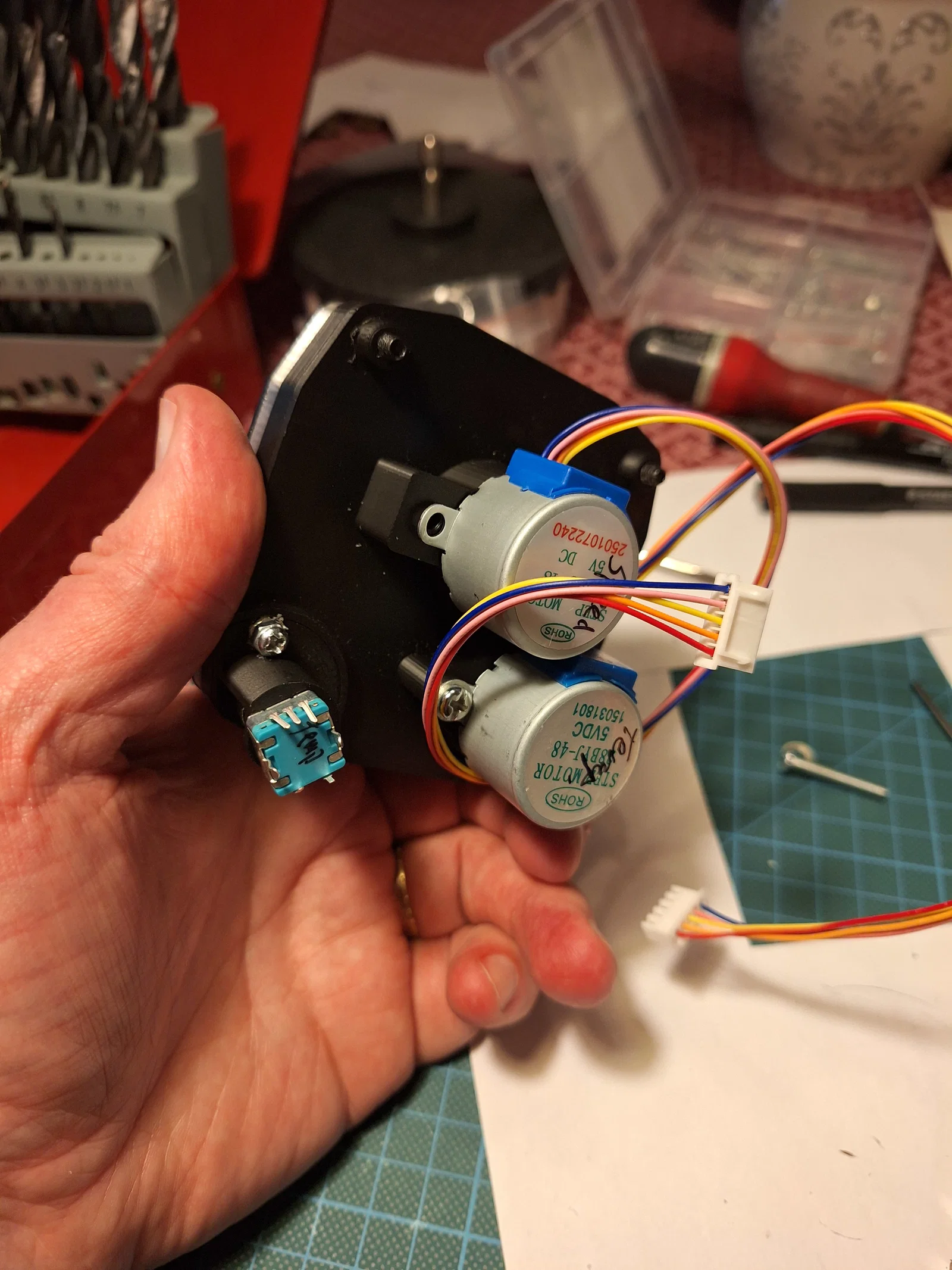 Vật liệu cần chuẩn bị: 2 cái động cơ bước 28BYJ-48 kèm mạch điều khiển ULN2003 1 cái Encoder EC11 (loại trục 15mm Plum) 1 tấm phim trong suốt kích thước Ø 79mm x 0.2mm 3 con ốc M4x25 4 con ốc M4x10 4 con ốc M3x10