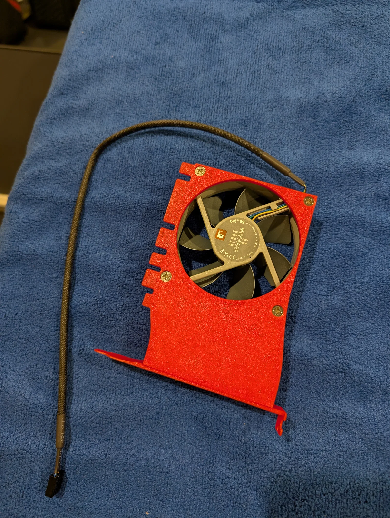Phần này được in làm hai mảnh để tăng độ chắc chắn. Để lắp ráp, bạn hãy dùng 4 ốc vít quạt để gắn quạt vào giá đỡ, và dùng thêm 2 con ốc nữa để kết nối hai mảnh lại với nhau như trong hình minh họa.