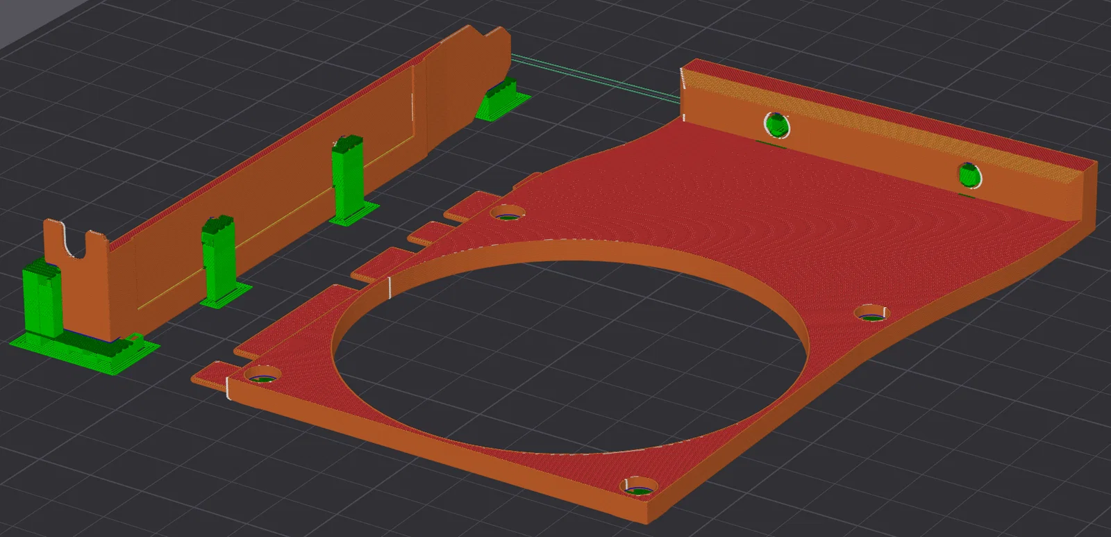 Bạn nên in theo hướng như trong hình, nhớ bật hỗ trợ (support), tốt nhất là dùng tree support. Mình khuyên nên dùng các loại nhựa có khả năng chịu nhiệt tốt hơn PLA như PETG, ABS hoặc ASA. Nhựa PLA có thể dùng được một thời gian, nhưng mình nghĩ nó sẽ bị cong hoặc biến dạng nếu nhiệt độ trong máy tính của bạn quá cao (mà chắc chắn là cao rồi, không thì bạn đâu cần in cái giá đỡ quạt này làm chi 🤣).