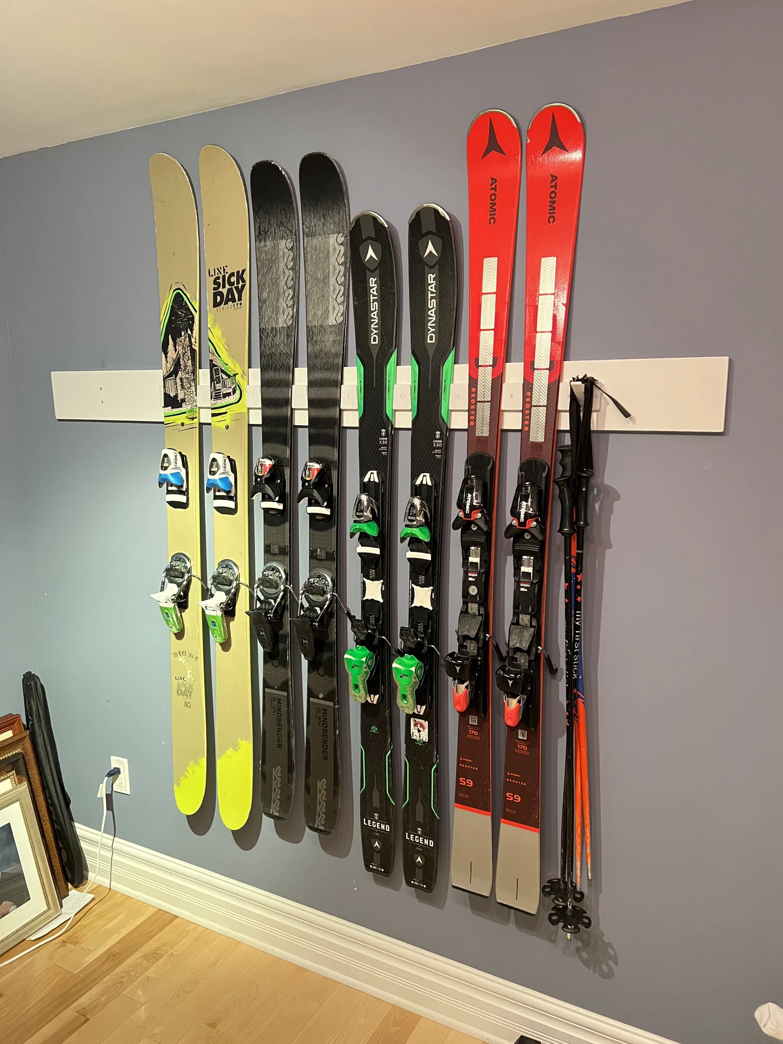 Mẫu giá treo ván trượt tuyết có thiết kế đẹp mắt và linh hoạt. Bạn có thể tùy chỉnh kích thước theo ý muốn để phù hợp với ván và gậy trượt của mình một cách dễ dàng và thẩm mỹ.