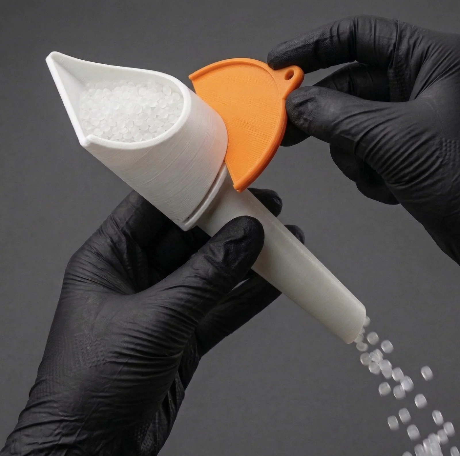Mình đã thiết kế chiếc dụng cụ đa năng này để giúp việc xử lý hạt nhựa trở nên dễ dàng và gọn gàng hơn trong xưởng của mình. Nó hoạt động như một chiếc muỗng xúc chính xác để bạn lấy nguyên liệu, nhưng điểm hay nhất là phần lõi màu cam có thể tháo rời; sau khi lấy ra, tay cầm sẽ biến thành một chiếc phễu, giúp các hạt nhựa chảy trực tiếp vào phễu nạp liệu hoặc các hũ lưu trữ.