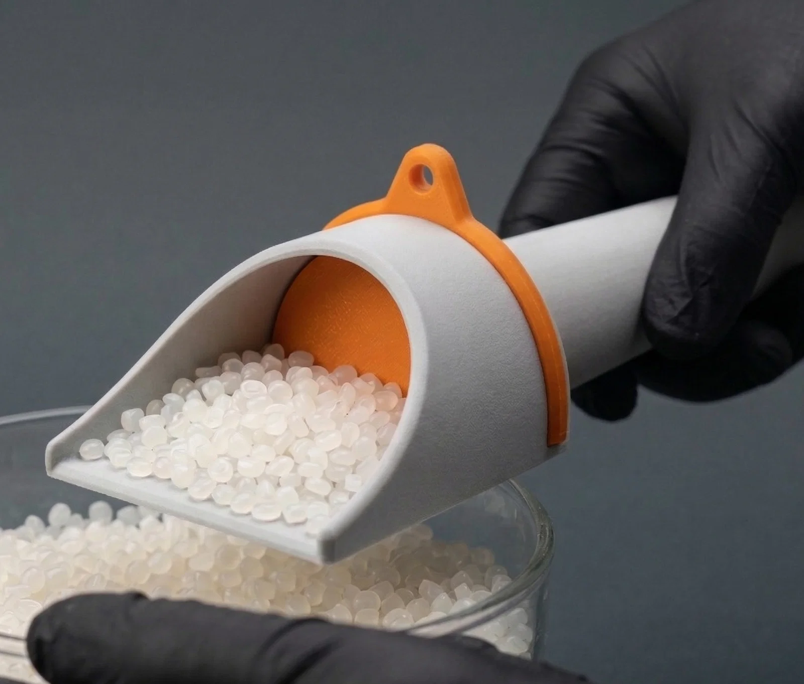 Dụng cụ 2 trong 1: Một chiếc muỗng xúc có thể biến thành phễu bằng cách tháo rời phần lõi bên trong. Sản phẩm hoàn hảo để thao tác với các loại hạt nhựa in 3D một cách gọn gàng và không gây bừa bộn.