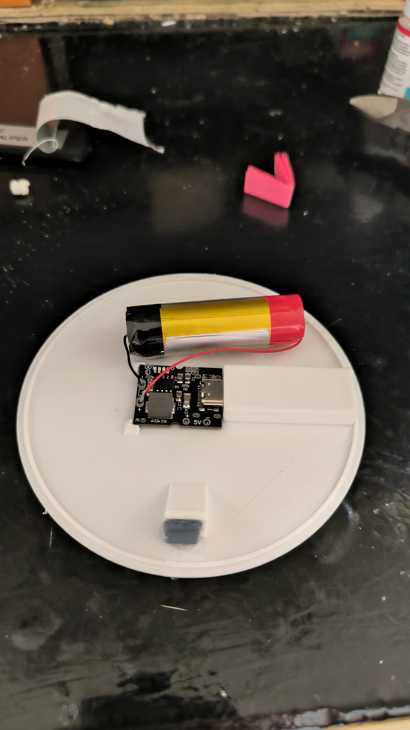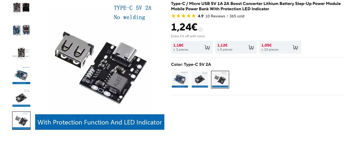 • Mình dùng một viên pin Lithium 3.7V cũ hàn vào mạch tăng áp (boost BMS) 5V 1A với cổng sạc USB-C.