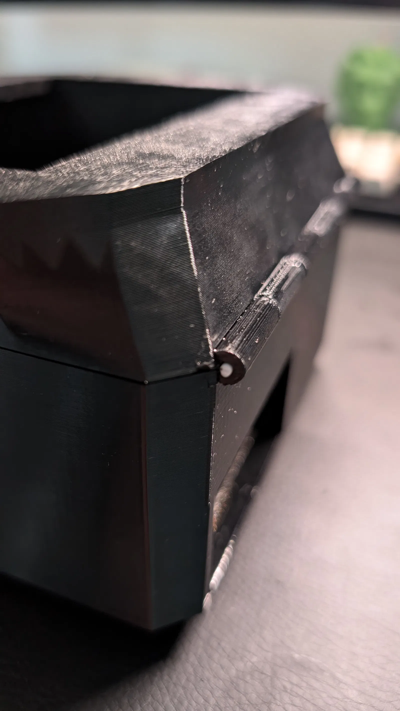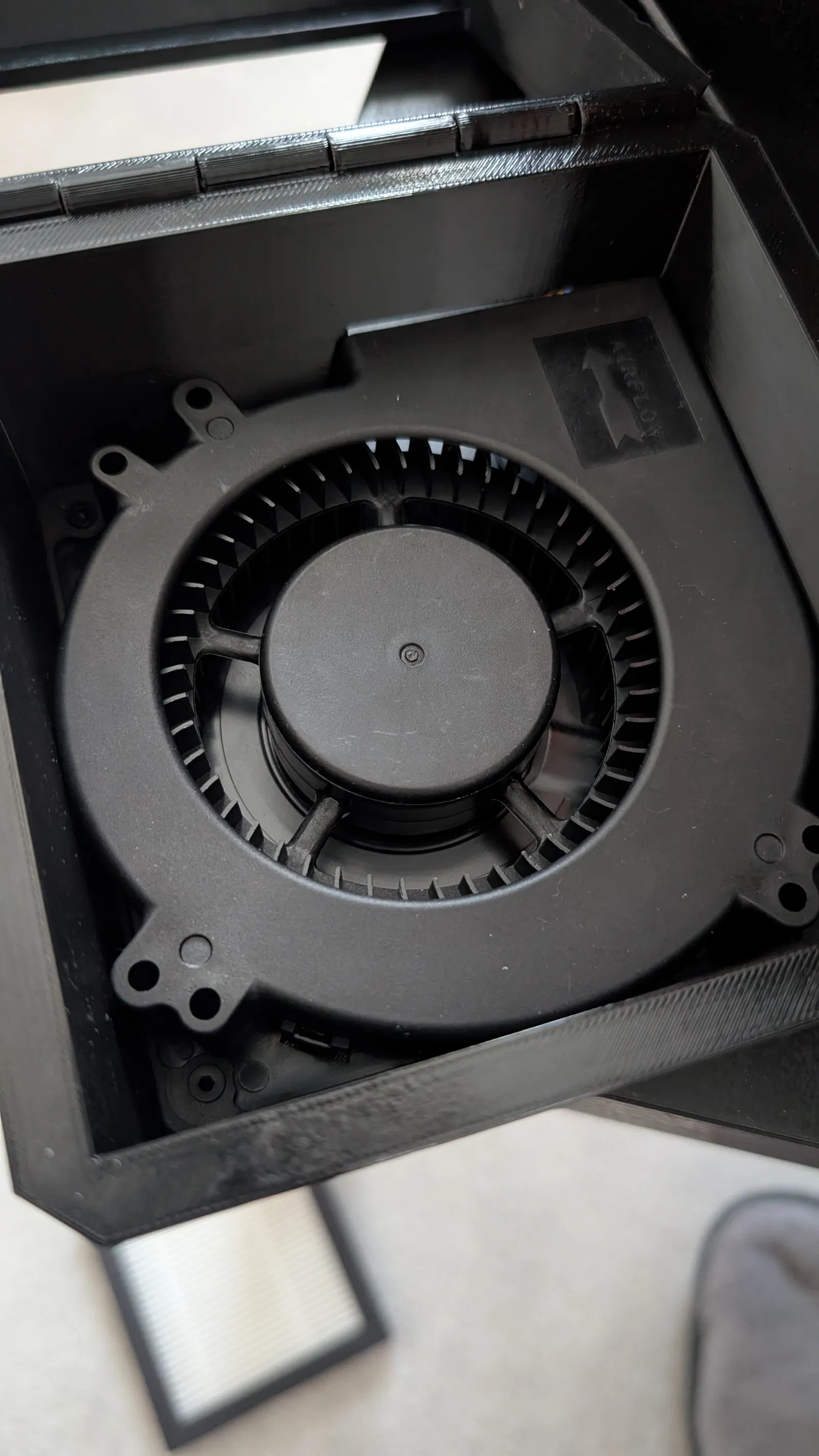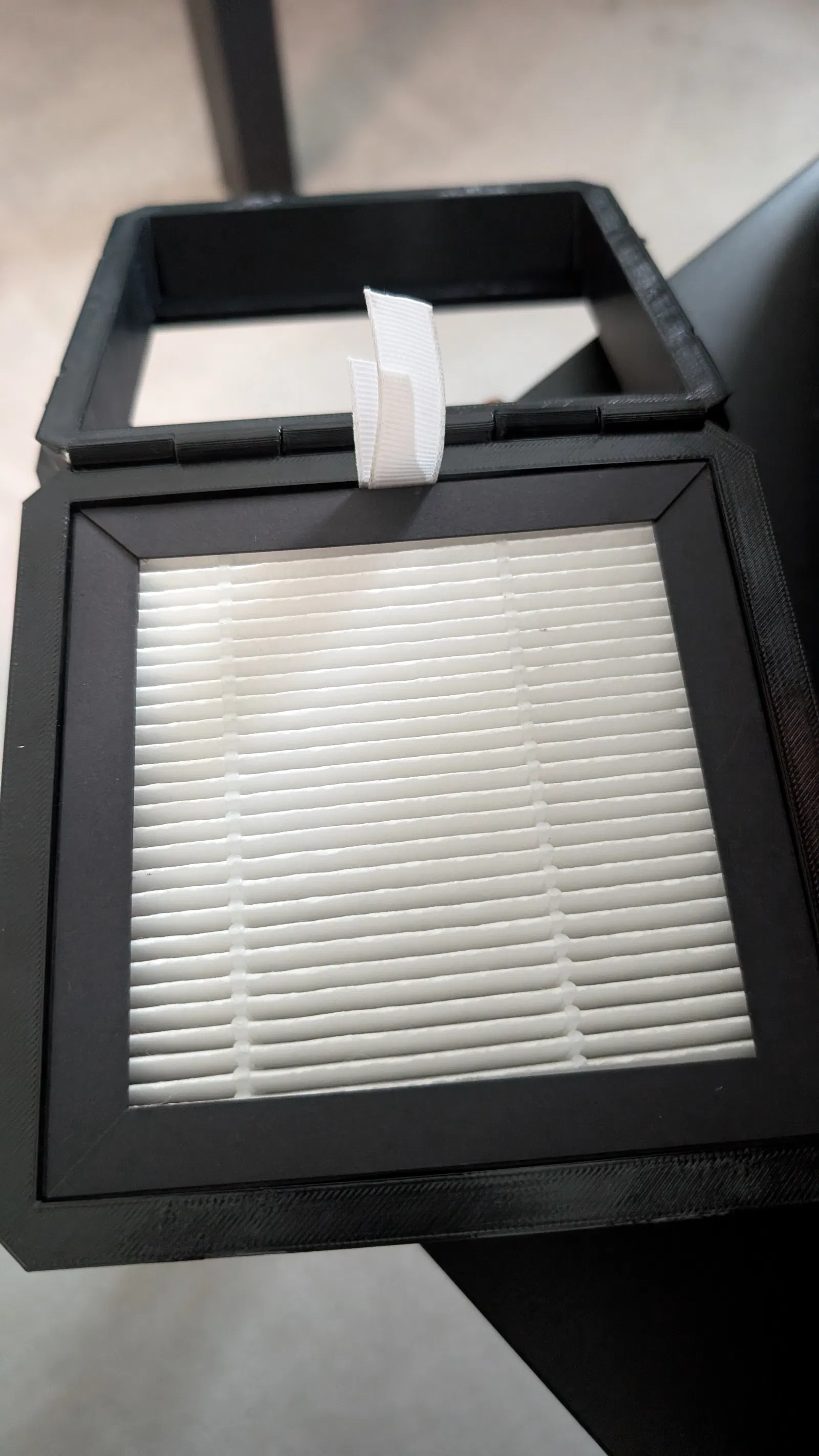 Mình thiết kế phần này để bạn có thể mở ra dễ dàng nếu muốn tăng lưu lượng gió, tuy nhiên có vẻ như chỉ cần lắp mỗi bộ lọc thôi là gió đã lưu thông rất tốt rồi. Ngoài ra, phần bản lề cũng được thiết kế để sử dụng chính đoạn filament 1.75mm làm chốt xoay.