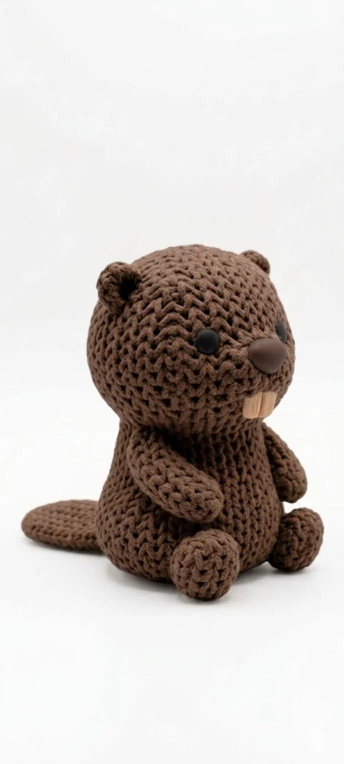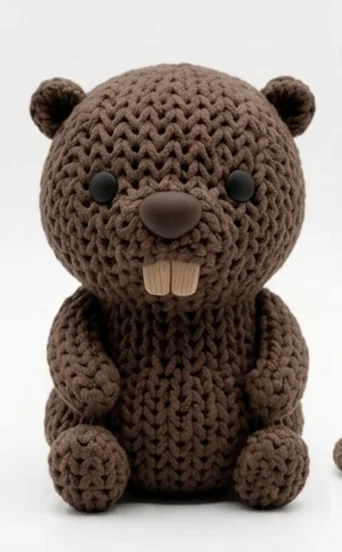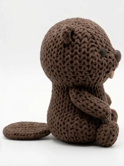 Một bé hải ly nhỏ nhắn mập mạp với bề mặt được thiết kế theo kiểu đan len/móc len vô cùng chân thực — đây là một phần trong bộ sưu tập thú len mà mình đang phát triển.