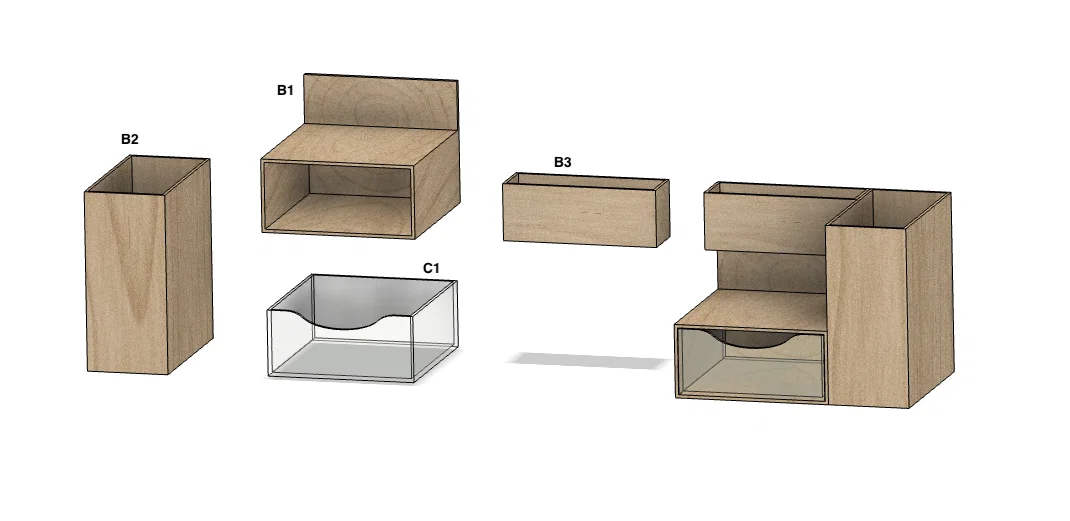 - Mẹo nhỏ: Bạn có thể in ngăn kéo (C1) bằng nhựa trong suốt (nếu máy in hỗ trợ) để dễ dàng quan sát đồ vật bên trong hơn.
