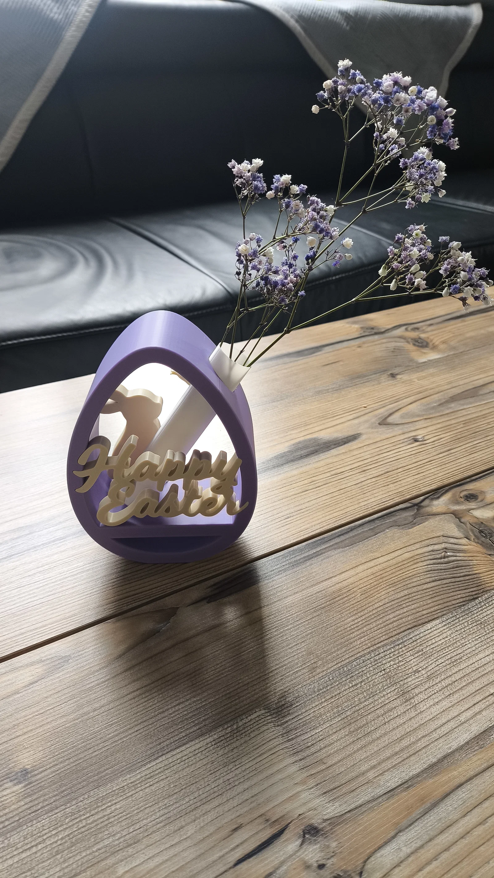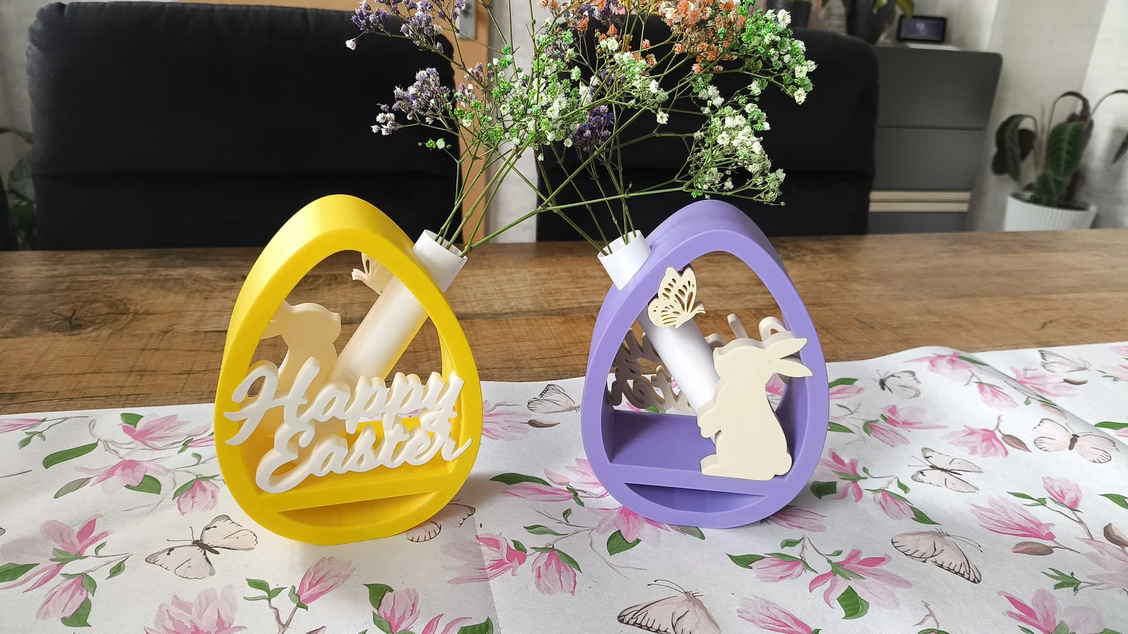 Mẫu trang trí bàn tiệc dịp lễ Phục sinh vô cùng xinh xắn. Thiết kế quả trứng cách điệu kết hợp bình hoa, thích hợp để cắm hoa giả hoặc hoa tươi, tạo điểm nhấn nổi bật cho không gian kệ tủ hay bàn ăn trong nhà bạn.