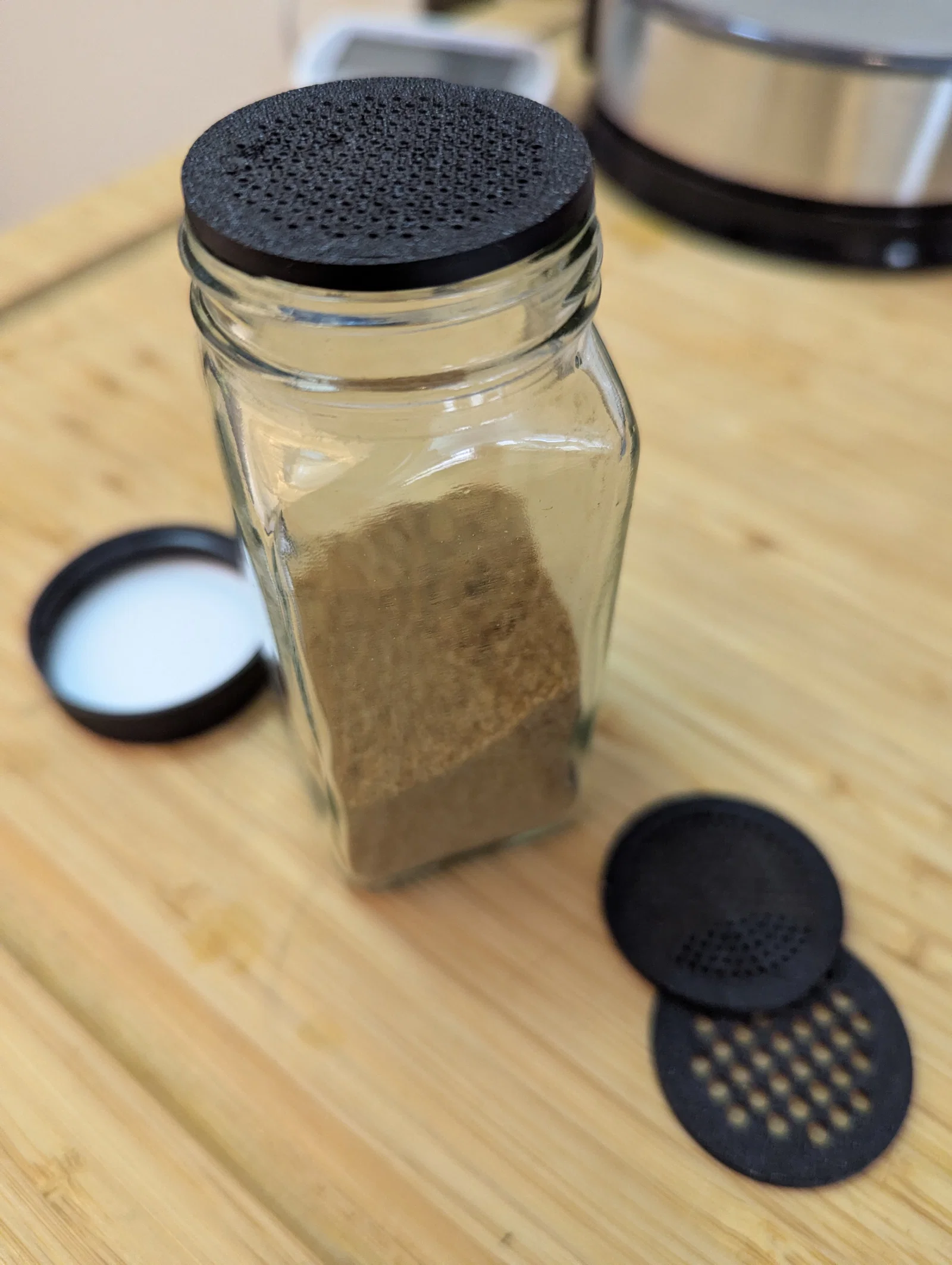 Tôi thường thấy các miếng gắn nắp lọ gia vị loại thông thường có lỗ quá nhỏ, khiến tôi phải tháo ra rồi làm mất tiêu, hoặc là lỗ quá to làm gia vị đổ ra quá nhiều mỗi lần dùng. Gần đây, khi sắp xếp lại gia vị vào các lọ có kích thước tiêu chuẩn, tôi nghĩ tại sao mình không tự thiết kế nắp lắc gia vị cho vừa ý nhỉ. Tôi đã chọn ra ba kích thước lỗ là 1mm, 1.5mm và 3mm. Thiết kế này cũng khá dễ để bạn tự điều chỉnh kích thước theo ý muốn. Những nắp này được thiết kế để vừa với các lọ gia vị dùng nắp 43mm, cụ thể là loại lọ này: https://www.specialtybottle.com/glass-bottles/french-squares/4oz-fsq4. Vì không muốn nắp bị bung ra khi đang lắc ở thiết kế lỗ nhỏ nhất, nên tôi đã làm cho nắp có độ khít RẤT chặt. Bạn có thể cần điều chỉnh lại một chút nếu dùng cho các loại lọ tương tự khác do sai số trong quá trình sản xuất thủy tinh và kích thước nắp tiêu chuẩn.