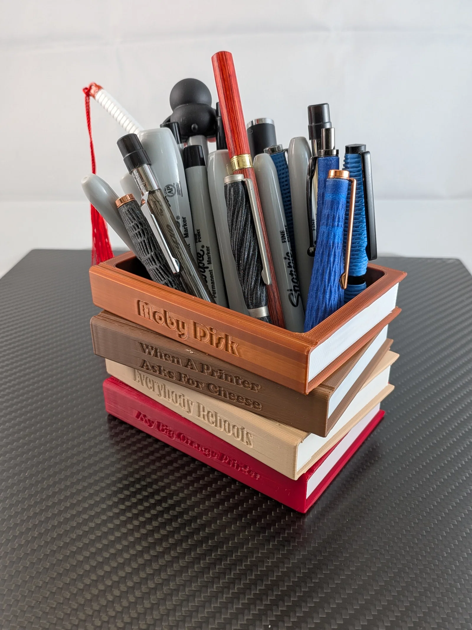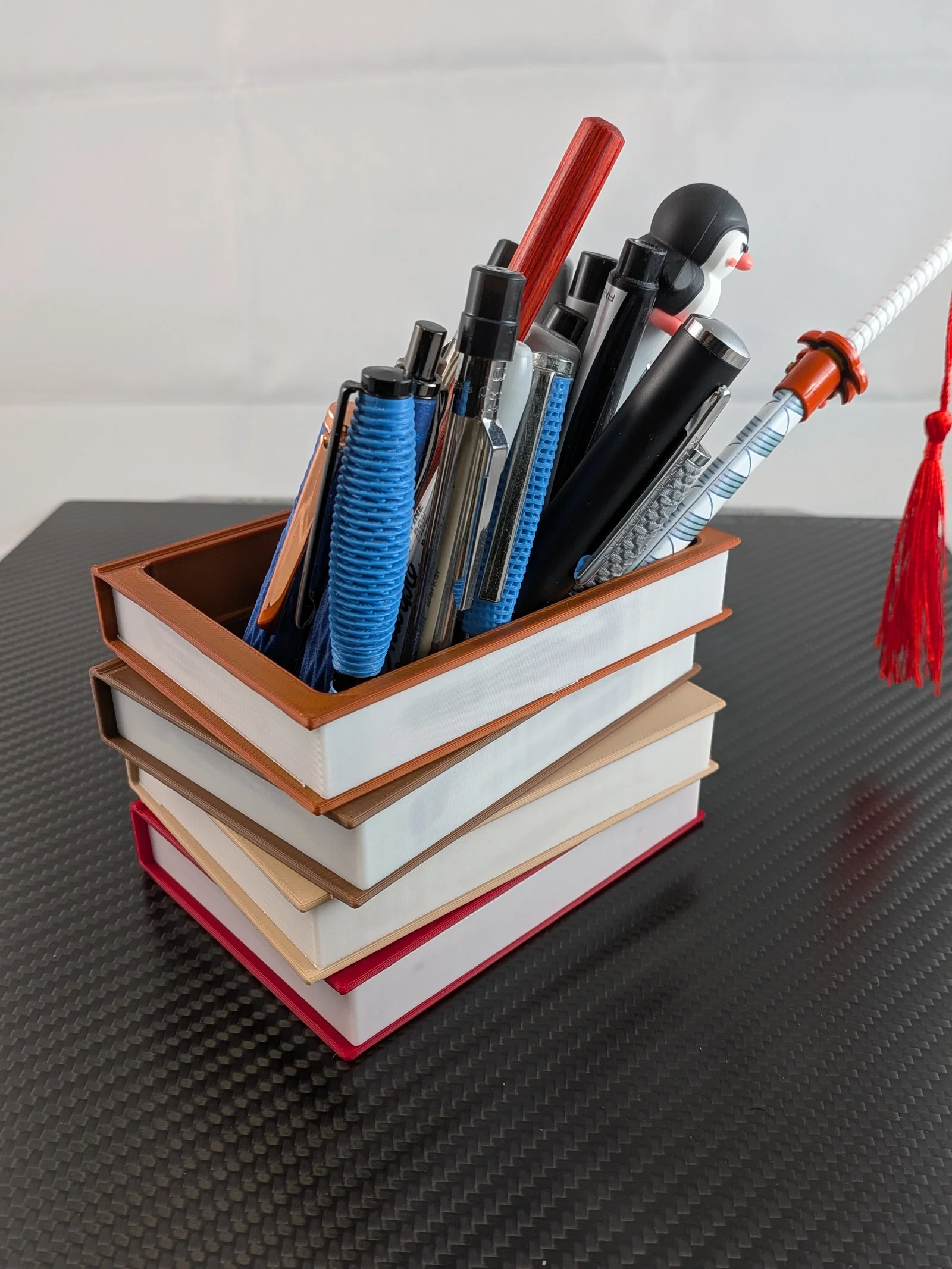 Sắp xếp lại góc làm việc của bạn gọn gàng hơn với mô hình ống đựng bút độc đáo này. Thiết kế mô phỏng hình dáng một chồng sách cũ, vừa là vật dụng hữu ích, vừa là điểm nhấn trang trí tinh tế cho bàn học của bạn.